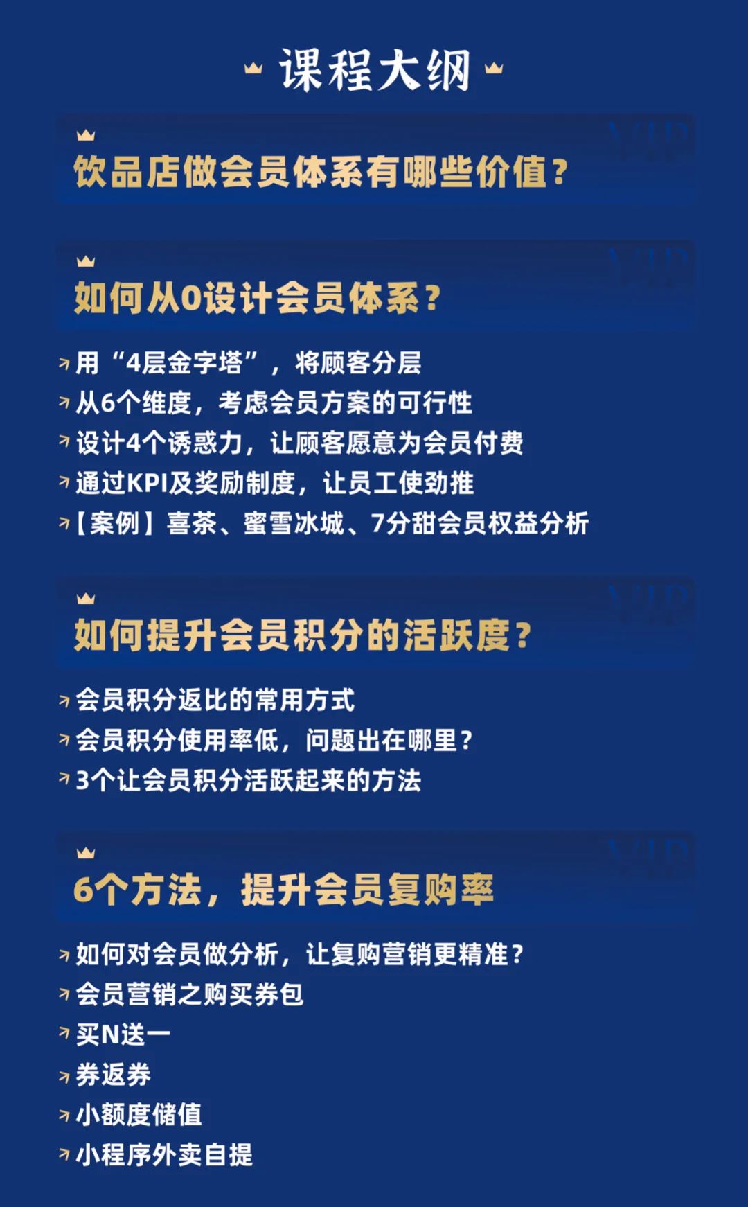 - 飲品店從0打造會員體系要考慮哪些因素?付費(fèi)會員政策如何設(shè)計(jì)?怎么讓會員積分真正流轉(zhuǎn)促活?提升會員復(fù)購率有什么具體方法?今天,我們請來有9年餐飲數(shù)字化運(yùn)營實(shí)戰(zhàn)經(jīng)驗(yàn),服務(wù)過蘇小柳、鮮芋仙、小龍坎、望湘園的彭星星老師,推出這門實(shí)戰(zhàn)全新課程《多拉新、高復(fù)購,會員體系打造3講》。結(jié)合喜茶、蜜雪冰城、肯德基、麥當(dāng)勞等多案例、多品牌、實(shí)研究,用3講內(nèi)容,講透會員體系的打造方法。