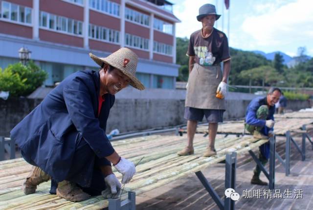 所謂“粒粒皆辛苦”,用在咖啡身上一點也不為過,請珍惜每一杯到你身邊的咖啡,這些,都是這些咖農(nóng)辛勤勞動的結晶!一.采摘云南咖啡園的采摘季節(jié)從10月到次年的3月,采摘高峰出現(xiàn)在12月-1月,納吉莊園的咖啡果均是手工采摘,只摘取成熟的果實,保證咖啡品質。二.運輸咖啡的種植環(huán)境很關鍵,只有適合的氣候和環(huán)境才能出品好咖啡,這里的咖啡基本是種植在半山坡,運輸只能靠摩托和手扶拖拉機(以前還要靠牲口來運輸,更加辛苦)。三.交易咖農(nóng)在所承包的咖啡園辛勤勞作,收獲季節(jié)手工采摘后再運到指定的交易地點,按重量賣給采購方,咖啡鮮果采購價3-5元/公斤,必須是全紅果實才接收。經(jīng)過后期處理,平均每6公斤鮮果才可收獲1公斤生豆。四.處理咖啡果實統(tǒng)一采購后要及時進行后制處理,圖1為水洗過程中工人的勞作場景,圖2-5為水洗后在架曬的時候工人將其中一些雜質或沒處理干凈的果肉果皮去掉。五.曬場咖啡豆的干燥有地曬(圖1)和架曬(圖2)兩種,都是借助太陽光的熱量將咖啡豆干燥到合適程度再進行儲存。這次還有幸拍到了咖農(nóng)在搭曬架的畫面(圖3-5).六.宗教納吉莊園所在的納吉村,村民大部分是從怒江遷移過來的傈僳族,有自己的民族語言(圖4就是村長用當?shù)卣Z言給我們講話,還得旁邊的姑娘給翻譯給普通話給我們聽),他們信仰天主教,每周日禮拜日都是休息不勞作,晚上還會到教堂里做禮拜,載歌載舞,發(fā)自內心的笑容也特別讓人感動。看到這里,如果其中有那么一兩張圖片打動了你,那就動動手分享到你的朋友圈吧,讓更多人來記住這些面孔!