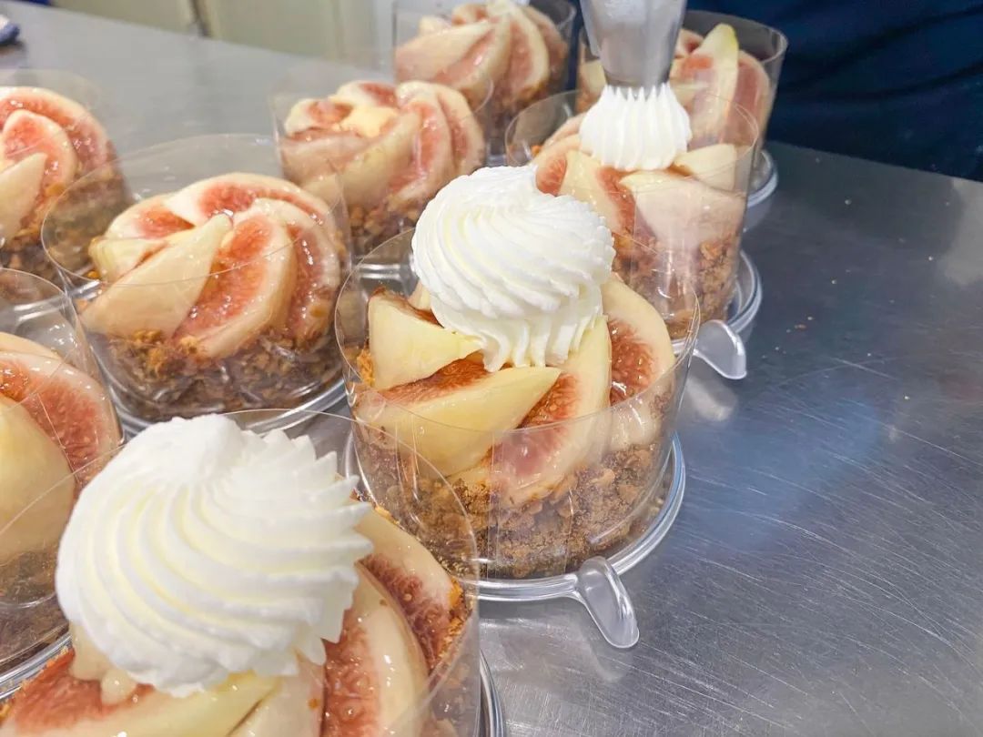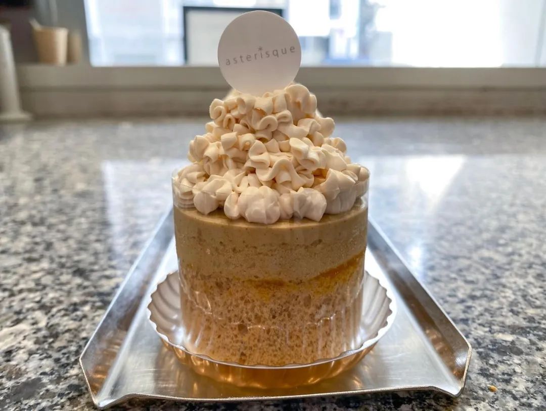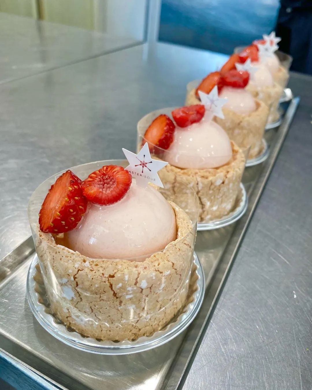 配方量:20個撻殼【980克】224 克……黃油(軟化)138 克……糖粉 52 克……杏仁粉 4 克……海鹽(鹽之花) 50 克……蛋黃 40 克……全蛋376 克……T45面粉 96 克……T55面粉制作:1、將軟化的黃油與糖粉放入攪拌缸中用扁槳/葉槳攪打至均勻順滑。2、加入杏仁粉繼續(xù)攪拌。3、加入蛋黃和全蛋液攪拌,最后將兩種面粉及海鹽加入攪拌均勻形成面團狀,冷藏隔夜。4、次日,搟壓至2毫米厚度,鋪入直徑8CM的撻模內。5、入烤箱以150℃烘烤約25-30分鐘。栗子慕斯【385.7克】(半球硅膠模具:PavoFLEX) 63 克……牛奶 27 克……蛋黃4.5 克……細砂糖0.2 個……香草莢 4 克……吉利丁片(200Bloom) 96 克……栗子餡(chestnut paste,Imbert?) 27 克……栗子抹醬(chestnut cream,Imbert?) 20 克……朗姆酒144 克……35%稀奶油制作:1、將牛奶、蛋黃、細砂糖和剖開刮籽的香草莢加熱制成82℃的英式蛋奶醬,加入提前用冷水泡軟的吉利丁片拌融。2、將栗子餡(chestnut paste,Imbert?)、栗子抹醬(chestnut cream,Imbert?)和朗姆酒混合攪打至順滑,加入步驟1的“英式蛋奶醬”。3、冷卻后將半打發(fā)的稀奶油輕輕拌勻。4、擠入半球形硅膠模具內,冷凍。香草巴伐利亞奶油【986.5克】383 克……牛奶127 克……蛋黃127 克……細砂糖0.5 個……香草莢 9 克……吉利丁片(200Bloom)340 克……35%稀奶油制作:1、將牛奶、蛋黃、細砂糖和剖開刮籽的香草莢加熱制成82℃的英式蛋奶醬。2、加入提前用冷水泡軟的吉利丁片拌融。3、冷卻后,將半打發(fā)的稀奶油加入拌勻。4、擠入冷凍的模具內的“栗子慕斯”上,繼續(xù)冷凍。黑醋栗果醬【144克】50 克……整粒黑醋栗(Sicoly)50 克……黑醋栗果茸(無糖) 4 克……檸檬汁16 克……葡萄糖漿22 克……細砂糖 2 克……NH果膠粉制作:1、將黑醋栗與果茸、檸檬汁和葡萄糖漿混合加熱至50℃。2、將細砂糖與NH果膠粉拌勻后加入,繼續(xù)加熱煮沸。3、冷卻后,倒入冷凍的模具內“栗子慕斯/香草巴伐利亞奶油”的頂部,繼續(xù)冷凍。栗子席布斯特【235克】50 克……栗子泥(chestnut puree,Imbert?) 9 克……細砂糖A10 克……水A 3 克……玉米淀粉 3 克……吉利丁片(200Bloom)10 克……朗姆酒60 克……細砂糖B30 克……水B60 克……蛋白制作:1、將栗子泥(chestnut puree)與細砂糖A、水A加熱制成類似卡仕達狀態(tài)。2、加入冰水泡軟的吉利丁片拌融,再將朗姆酒加入。3、將細砂糖B與水B在厚底平底鍋中加熱至121℃,沖入正在打發(fā)的蛋白內,繼續(xù)高速攪打至降為室溫的意式蛋白霜。4、將蛋白霜加入到“步驟2”中拌勻。栗子奶油【650.6克】500 克……栗子餡(chestnut paste,Imbert?) 50 克……栗子抹醬(chestnut cream,Imbert?)100 克……黃油0.6 克……海鹽(鹽之花)制作:1、全部材料混合打發(fā)。組裝與裝飾適量……糖粉制作:1、將“栗子奶油”擠入烤熟冷卻的撻殼內,冷凍后然后將冷凍脫模的半球形“栗子慕斯/香草巴伐利亞奶油/黑醋栗果醬”放在頂部,冷凍至完全結合穩(wěn)定。2、將之倒立,半球形浸入“栗子席布斯特”內輕輕上下提動幾次確保半球形被完全覆蓋,然后表面用火槍微灼后,撒適量糖粉。