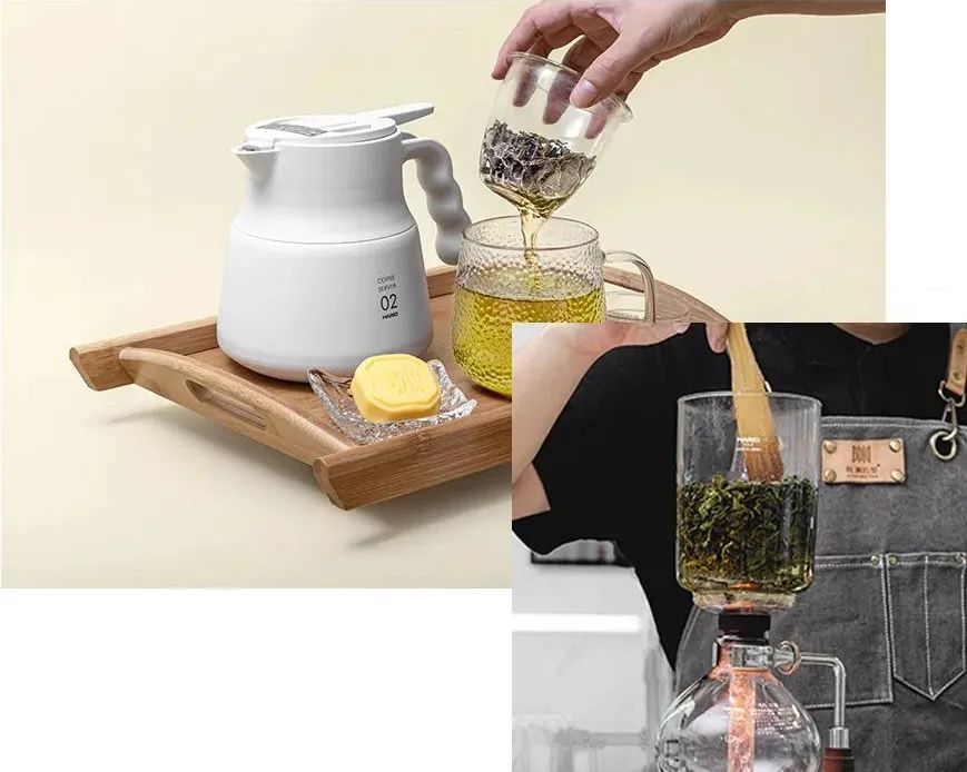 虹吸壺現(xiàn)萃原葉茶虹吸壺分為上壺、下壺和熱源。茶葉放置于上壺中,利用水加熱后產(chǎn)生蒸汽,造成壓力,將下壺的熱水推至上壺,等到下壺冷卻后,再把上壺的水吸回來(lái)。每杯茶現(xiàn)萃的時(shí)間大約1~2分鐘。從傳統(tǒng)意義上來(lái)說(shuō),這樣的做法似乎很不“中式”,但以此帶來(lái)強(qiáng)烈的視覺(jué)沖擊,正起到了吸引年輕人接觸原葉茶的作用;而高溫加壓的方式,又能更好地呈現(xiàn)茶葉品質(zhì)。際淵“西學(xué)中用”,以復(fù)古而務(wù)實(shí)的姿態(tài),傳遞“新中式”的又一種解讀。