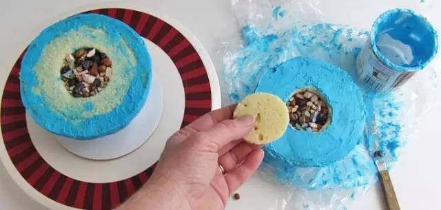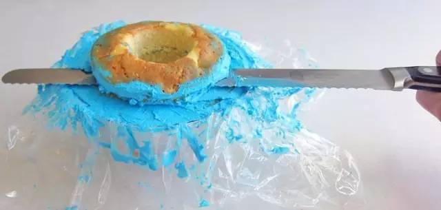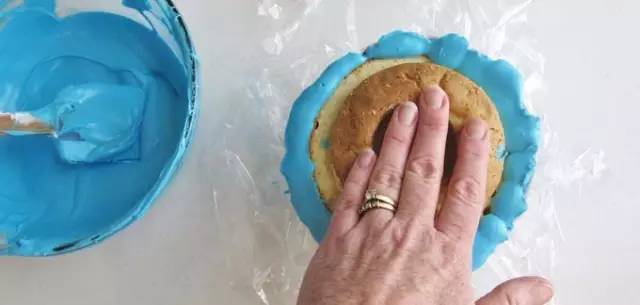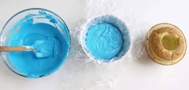 裝飾①將少量黃油霜調(diào)成藍(lán)色,抹在蛋糕上邊,將兩個(gè)半球拼在一起