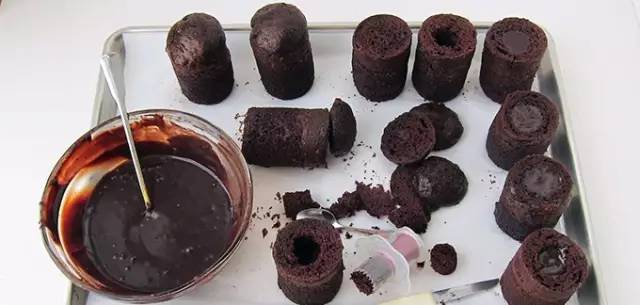 ④削去可可蛋糕體的頂部,并在蛋糕體內(nèi)挖出一個(gè)小洞,將稍微放涼的百利甜甘納許灌入洞中,備用