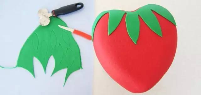 ③將綠色色素加在剩下的翻糖膏中,將翻糖膏調(diào)成綠色,搟薄后制成草莓蒂的形狀,貼合在紅色糖皮之上