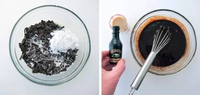 百利甜甘納許①首先將黑巧克力隔水加熱至50度左右,將黑巧克力融化(盛放巧克力的容器不能有水,也不能讓水汽進(jìn)入巧克力中)②將淡奶油倒入復(fù)合平底鍋中,中小火加熱淡奶,將淡奶煮至即將沸騰的狀態(tài),趁熱沖入到步驟①的巧克力中,靜置約1分鐘③將糖粉與百利甜酒加入到步驟②的混合物中,用蛋抽輕柔的攪拌混合物,使混合物完全融合