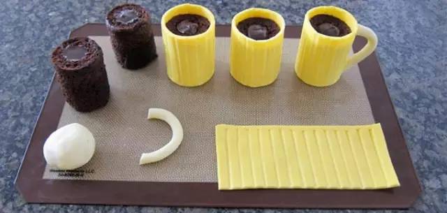 ④用原色翻糖膏搓成細(xì)棍,做成杯把,蘸取少許清水,貼在黃色翻糖皮的表面