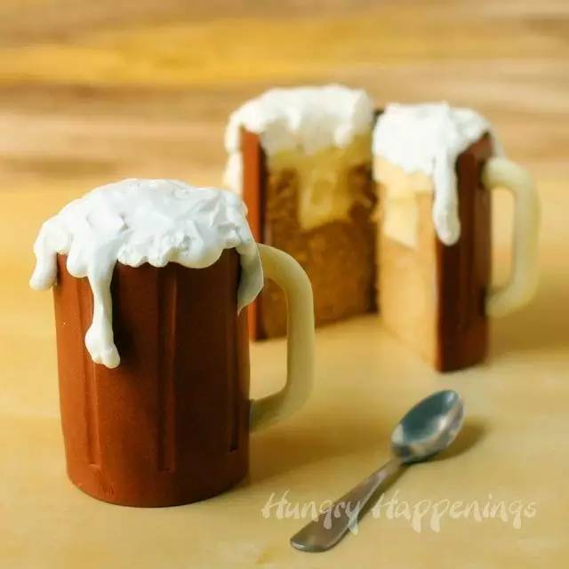 ⑤淡奶油打至約5分發(fā)(濃稠的流體狀),填入翻糖皮內(nèi),做成啤酒泡沫的效果,即可完成