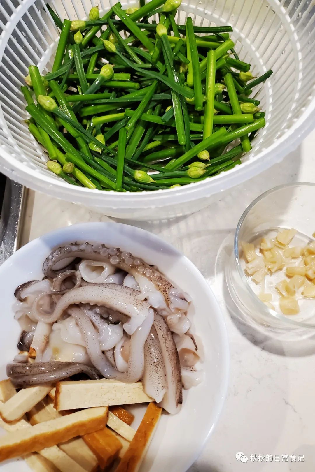 隨便搭配了一些家常材料做的一盤韭菜花小炒,咸香之中帶有微辣,沒有技術(shù)含量但非常美味下飯。魷魚和韭菜花是經(jīng)典搭配,加入肉末