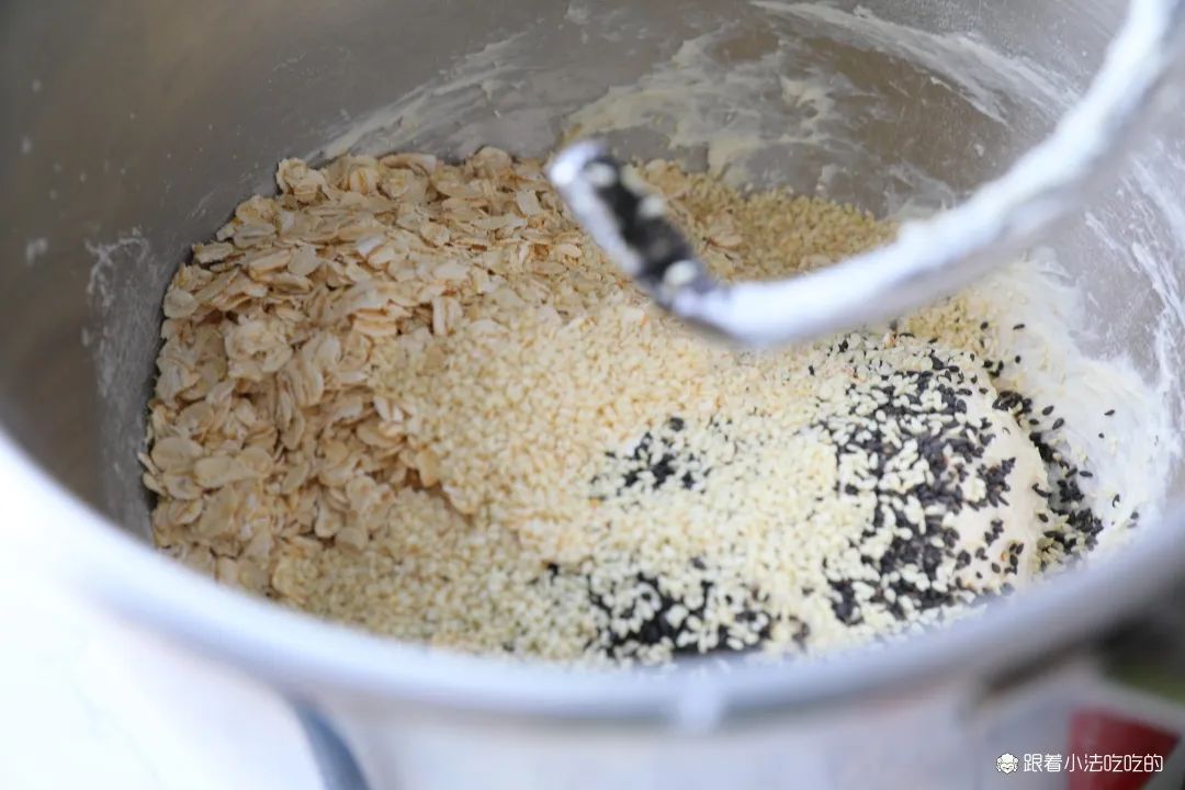 ①除黑白芝麻、燕麥片外,面團(tuán)材料,包括老面在內(nèi)都加入廚師機(jī)揉成團(tuán)。揉出相對(duì)能拉出厚一點(diǎn)的膜加入配料,揉均勻。