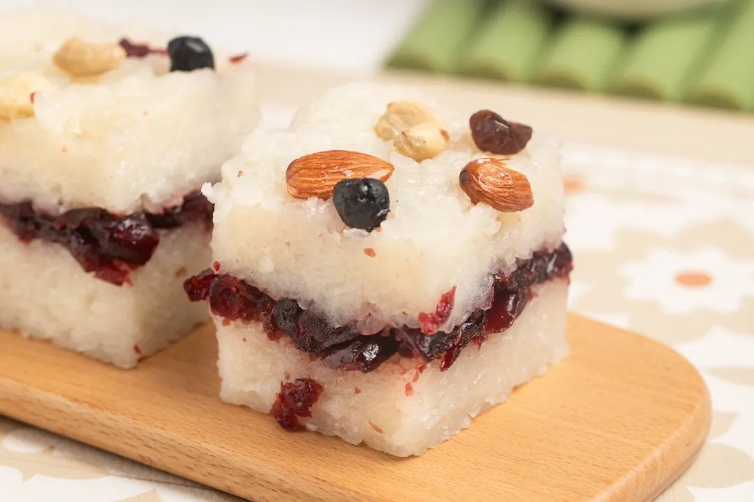 ?除了西瓜、雪糕,還有什么吃食能讓人在燥熱的夏天冷靜下來?要說的話,涼糕絕對(duì)算一個(gè)!今天要做的這款蜂蜜涼糕,是西安城里比較受歡迎的一種吃食,聽這個(gè)名字就知道它是有多適合夏天的時(shí)候吃了,涼涼的蜂蜜澆在涼糕上,水果的清甜再配上堅(jiān)果的香脆,滿口留香!傳統(tǒng)的涼糕,中間夾的是甜甜沙沙的豆沙餡,但在夏天,人們明顯更中意酸甜的口感,所以可以將豆沙餡換成酸甜口的蔓越莓餡。將蒸熟的糯米放涼,用搟面杖碾壓成泥狀,再放上蔓越莓碎,用手?jǐn)D壓鋪開,顏色自帶著可愛屬性,紅白相交,還會(huì)撒上各式的堅(jiān)果碎。蔓越莓的清甜滋味占據(jù)鼻尖,軟糯又清香,溫柔的包裹口腔,甜而不膩,一口就上癮。整塊涼糕先用刀切成條狀,再切割成大小均勻的小塊,澆上糖桂花或者玫瑰醬,就可以開吃了。蜂蜜涼糕圓糯米1000g蔓越莓干200g細(xì)砂糖50g蜂蜜40g堅(jiān)果碎50g①糯米洗凈,清水浸泡一晚②泡好的糯米加入適量清水,水開后大火蒸完全熟透;③蒸好的糯米飯,趁熱加入細(xì)砂糖,并在碗中碾壓成泥;④蔓越莓干加入少量清水蒸熟,蒸熟后碾壓成泥;⑤烤盤上墊上一層油紙,在底部鋪上一層糯米飯,再鋪上一層蔓越莓,最后在最上層鋪上剩下的糯米飯,抹平壓實(shí);⑥在頂部刷上一層薄薄的蜂蜜,并鋪上一層堅(jiān)果;⑦冰箱冷藏后切成小塊即可;如果有其他疑問請(qǐng)?jiān)谙路搅粞越o我們看到后一定盡力回復(fù)大家?(^?^*)