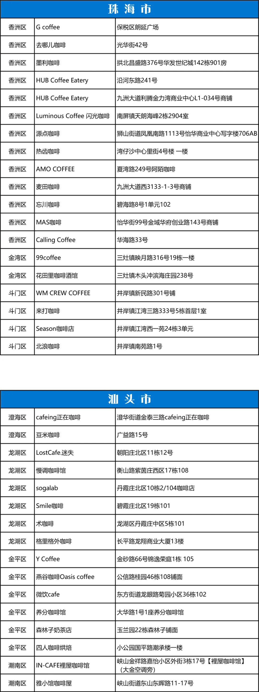 2022CAFEEX深圳咖啡與飲品展/深圳咖啡節(jié)因不可抗力改期至9月舉辦。雖然不少小伙伴感覺心里被澆了一盆冷水,但我們相信“好飯不怕晚”,我們將有更充足的時間做準(zhǔn)備,將展會細(xì)節(jié)完善。所有已經(jīng)獲得預(yù)登記贈票的觀眾權(quán)益不變,“探店贈票”活動也會順延至9月5日。之前還沒來得及探店的朋友又有機會參與本次贈票活動啦!好事不怕多磨,2022CAFEEX深圳展的精彩在9月依然不會少~探店贈票活動詳情請參考以下說明:今年CAFEEX深圳展推廣規(guī)模再升級,我們與超過600家咖啡館聯(lián)動,在店內(nèi)放置CAFEEX深圳展海報,一起為2022CAFEEX深圳展造勢!為了回饋大家的支持,CAFEEX特別推出“探店贈票”活動:打卡三家放置有CAFEEX海報的咖啡館就可獲得一張免費門票(價值100元/張)。由于今年合作店鋪數(shù)量過于龐大,小伙伴們表示刷文章找地址實在多有不便,所以在此奉上最新版的【2022CAFEEX深圳展合作咖啡館名錄】,以便查閱。本次名錄按城市地區(qū)劃分,以深圳為主,廣州、中山、東莞、佛山、江門等城市也都各有幾十家合作店鋪。大家可以先找到所在城市和地區(qū),再就近探店。2022 CAFEEX深圳咖啡與飲品展/深圳咖啡節(jié)時間:9月16-18日地點:深圳會展中心2號館(福華三路)如何通過探店合作咖啡館獲得免費門票?1.探店三家貼有【CAFEEX深圳咖啡節(jié)】海報的咖啡館(每家店需有至少一項消費)2.添加CAFEEX客服微信3.發(fā)送探店照(照片需要有CAFEEX海報出鏡,每家店至少一項消費記錄)4.客服將為您登記免費門票1張備注:本次探店贈票活動限每人參與一次?;顒咏刂箷r間:9月5日18:002022 CAFEEX 深圳展合作咖啡館名錄感謝以上咖啡館對CAFEEX活動的大力支持!CAFEEX的成長與進步離不開你們的關(guān)注,期待9月16-18日在深圳會展中心與大家見面?!?img data-backh="4756" data-backw="578" data-cropselx1="0" data-cropselx2="578" data-cropsely1="0" data-cropsely2="4690" data-ratio="8.228" data-s="300,640" src="http://puruisaisi.cn/file/upload/202211/07/114622501.jpeg" data-type="jpeg" data-w="1000" >∶上屆 CAFEEX 深圳站現(xiàn)場【2022CAFEEX咖啡展總贊助商】∶業(yè)內(nèi)媒體支持媒體&支持單位戶外廣告支持票務(wù)平臺合作∶進入CAFEEX小程序搶購早鳥票∶ ?Contact us關(guān)于CAFEEX深圳站2022.9.16 ~18贊助、展位預(yù)定、媒體合作請咨詢:史 經(jīng) 理 洪 經(jīng) 理「18751205045」「18516315560」 預(yù)覽時標(biāo)簽不可點