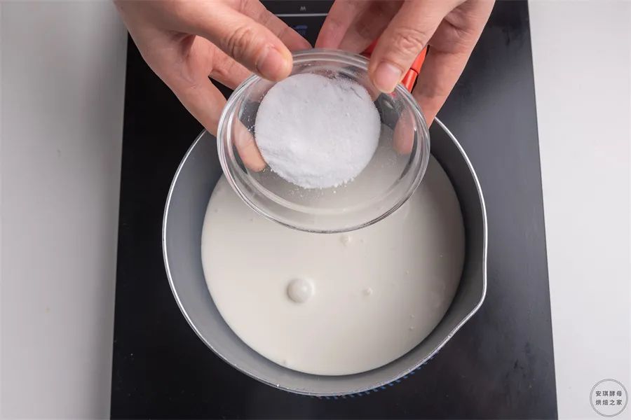 ⑤200g淡奶油中加入20g細(xì)砂糖,小火加熱,融化后加入白巧克力與抹茶粉,攪拌順滑后靜置。(抹茶粉可以先用少量淡奶油調(diào)勻后再加入,以免產(chǎn)生顆粒~)