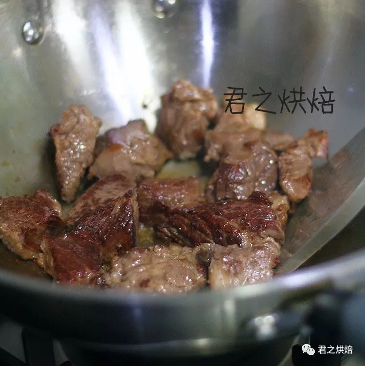 煎好牛肉以后,油仍留在鍋里。將胡蘿卜和洋蔥下到鍋里,炒到變色。炒好的蔬菜、牛肉、培根都倒入一個(gè)能放入烤箱的帶蓋的鍋里(全不銹鋼燉鍋、耐熱的砂鍋、琺瑯鍋均可,下文稱(chēng)烤鍋)。撒上鹽和胡椒粉。再撒上面粉。翻動(dòng)牛肉,使面粉均勻的裹在牛肉上。