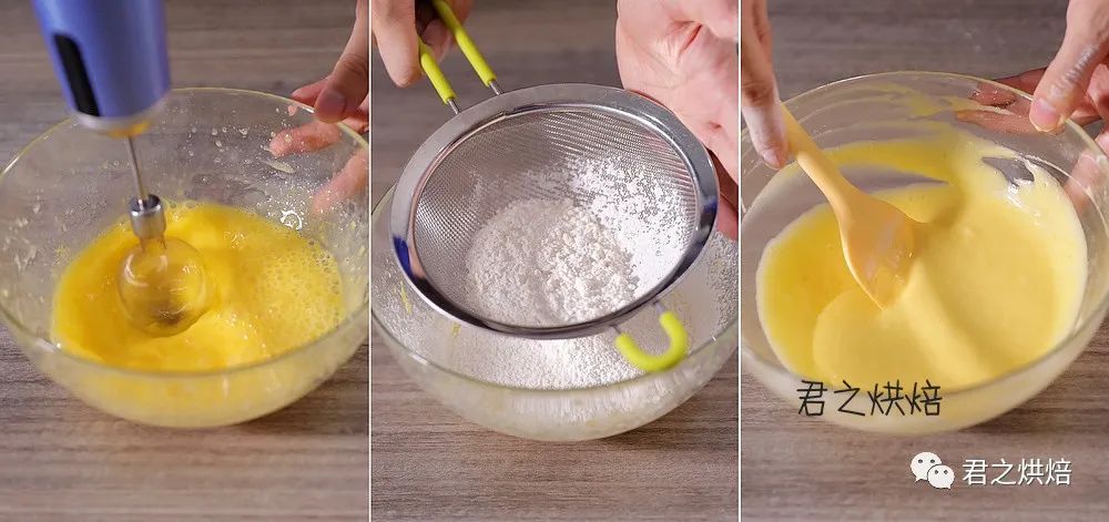 理論上,全蛋在43℃的溫度下最好打發(fā),所以你可以將打蛋盆坐在熱水里,使蛋液升溫到43℃左右,溫度不能太高,否則會影響蛋沫的穩(wěn)定性。步驟圖里我做的是6寸配方,只用打發(fā)2個雞蛋,還算容易打發(fā)的,如果你嫌麻煩,而且你的打蛋器功率比較高的話,也可以不加熱直接打發(fā)哈,只是會多花一點時間。也可以用廚師機來進行打發(fā)(推薦,會更省時省力),君焙G1/L1廚師機,高速攪拌(11檔)大約4分鐘即可。