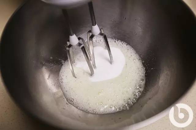 ⑤蛋白加糖用電動(dòng)打蛋器攪打至5分發(fā),有非常柔軟的大彎鉤,還不到濕性發(fā)泡狀態(tài)。