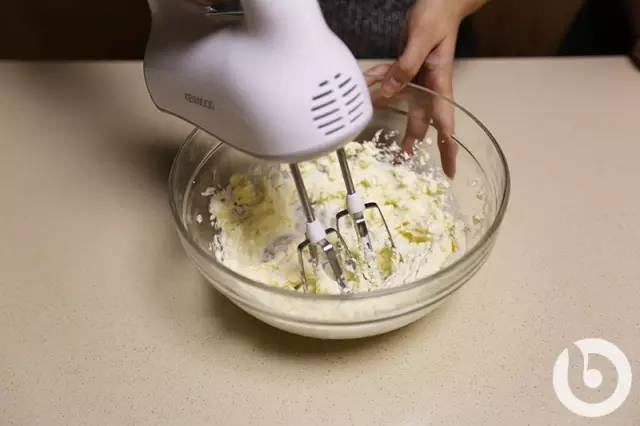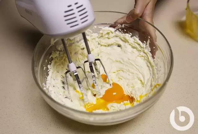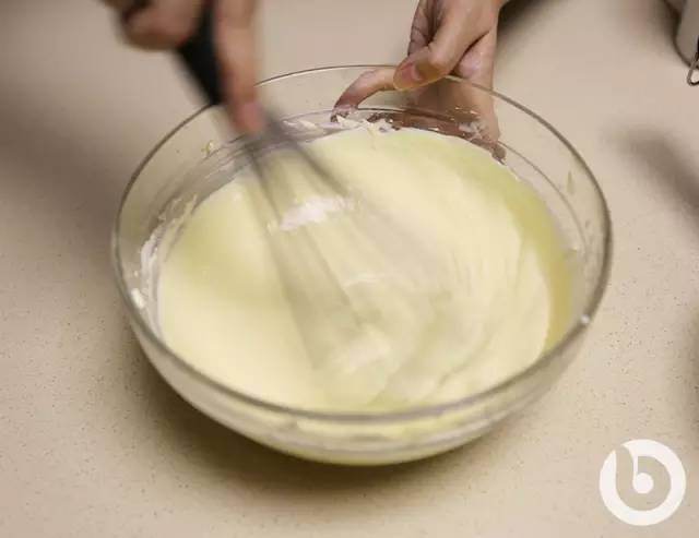 ②蛋黃加入奶酪中,繼續(xù)攪打勻。