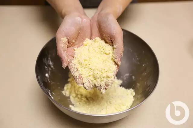 做撻皮:①冷黃油(不要事先拿出來(lái)軟化)切小塊,放入面粉中,用手搓成沙粒狀。