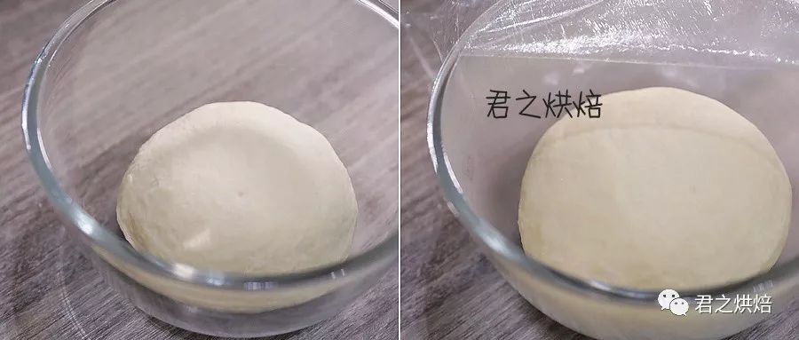 揉好的面團(tuán),放入大碗里。蓋上保鮮膜。室溫(25℃)發(fā)酵1個小時,直到面團(tuán)肉眼可見的變大(圖右)。然后將面團(tuán)放入冰箱(繼續(xù)蓋上保鮮膜防止表面干燥)。冷藏(4℃)36個小時。