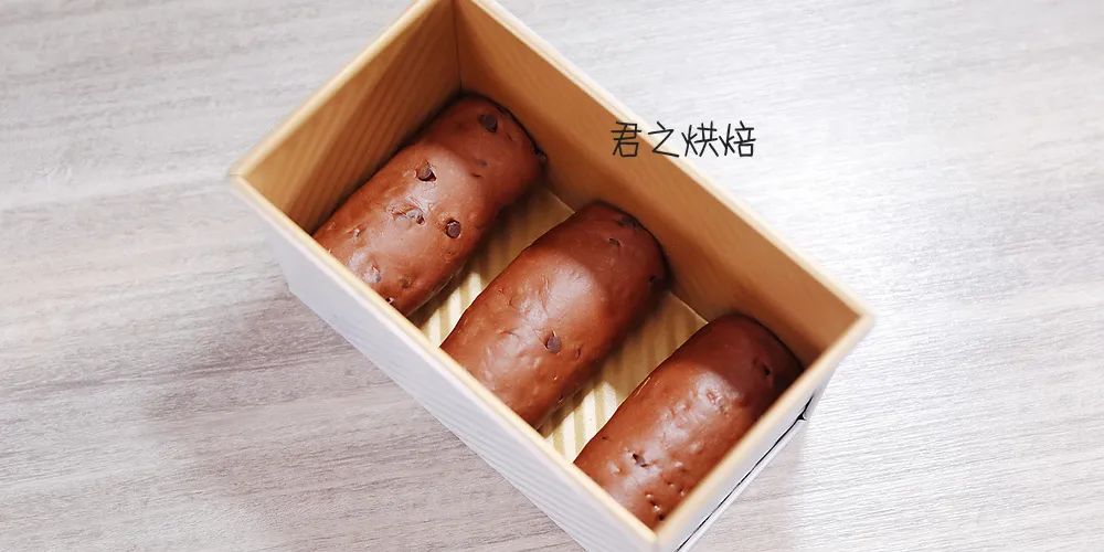 揉好的面團,加入巧克力豆,廚師機繼續(xù)低速(L1/G1 2檔,A5/A6 1檔)揉1分鐘?;蚴止と嗥?。直到巧克力豆均勻揉入面團中。將這個面團蓋上保鮮膜進行基礎發(fā)酵(溫暖的地方發(fā)酵到2倍大)。之后將面團重新排氣壓扁。如果想省時間,也可以省去基礎發(fā)酵,直接進行下一步(進行基礎發(fā)酵的面包口感會更好)。將面團均勻分成3份,分別揉圓,蓋上保鮮膜,松弛10分鐘。之后整型。取一個面團壓扁,用搟面杖搟開,將面團一邊拉直,向另一邊卷過去,將另一邊也拉直,完全卷起來,成為圓柱形。三個面團都卷好,放入450克規(guī)格的吐司盒。非防粘模具要薄薄涂抹一層黃油防粘??梢赃M行最后發(fā)酵了。吐司的最后發(fā)酵對濕度要求不高(直接蓋上吐司盒蓋子即可,或者在吐司盒表面蓋濕布),不需要額外創(chuàng)造濕度。發(fā)酵的時間根據(jù)溫度而不同。35℃可能需要1個半小時左右(視具體情況而定)。溫度越低時間越長,根據(jù)面團的高度來決定發(fā)酵時間。但一定不要發(fā)酵過度。發(fā)酵到模具高度的9分滿就可以準備烘烤了。蓋上吐司盒蓋子(如果你想做出表面鼓起的山形吐司,也可以不蓋蓋子)??鞠漕A熱至上下火170℃,將吐司盒放入烤箱下層,烘烤40分鐘左右即可出爐。出爐后脫模并放在冷卻架上冷卻即可。不同烤箱溫度情況不一樣,請根據(jù)實際情況調(diào)整。我用的君焙蒸烤箱。Tips:這個面包使用了湯種來制作,可以讓面團達到更高的水分含量和更柔軟的口感。只要制作到位,這款面包非常松軟可口!放三天依舊柔軟。它還有非常醇厚的巧克力味道,喜歡巧克力的童鞋一定會愛死它的! 預覽時標簽不可點