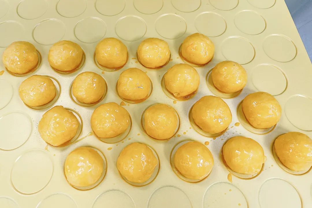 ①一粒生咸蛋黃噴白酒,放進(jìn)烤箱165度烘烤8分鐘,備用。