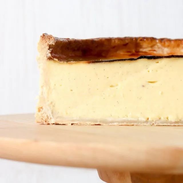 01/卡士達奶油餡70g70g170g170g780g85g2根玉米淀粉牛奶a蛋黃糖牛奶b黃油香草莢①在牛奶a中加入玉米淀粉,攪拌成糊狀,然后在一個小碗中水合玉米淀粉。②加入蛋黃,攪拌均勻。③過篩,隔水加熱(38-43℃),不斷攪拌。④煮沸牛奶b和香草莢,然后倒入混合物中,快速攪拌。⑤加入黃油攪拌均勻。保鮮膜貼面封膜,冷卻后保存。*85g黃油可以用300g巧克力代替。02/酥皮面團225g340g5g5g2g115g冷凍黃油面粉鹽糖香草粉冰水①將黃油切成方塊(2.5cm*2.5cm),然后將干性材料和黃油放入攪拌機中,中速混合均勻。②倒入冰水(無冰塊),攪拌成團。③放在鋪有烘焙紙的烤盤上,將面團壓扁至2.5cm厚,蓋上保鮮膜冷凍15分鐘,然后冷藏。④冷卻后,將面團搟至5mm,3折,將其旋轉90°搟至5mm后3折,冷卻30分鐘。然后再搟至5mm,松弛面團30分鐘。⑤在慕斯圈(深5.7cm*直徑19.7cm)內涂抹少許油,放在鋪有烤墊的烤盤上。將面團切出比慕斯圈大7.5cm的圓片。⑥將面團放入模具中,確保面團與慕斯圈齊平,多余的部分切掉,放入冰箱冷凍至面團變硬。⑦在面團內部放上錫紙,然后放一些派撻壓石(或者生的米?;蚨棺樱?,放入烤箱175℃烤制呈現金棕色。⑧去掉壓石,用叉子扎孔,放回烤箱進一步烘烤至淺金黃色。⑨在烤好的撻殼中加入卡仕達奶油餡至頂部,用刮刀抹平。⑩再次放入烤箱烘烤約1小時至1小時10分,直到卡仕達奶油餡表面呈褐色。冷卻后冷藏至少2小時后食用。酥脆加柔軟加奶香,期待引領下一個潮流~(圖片來源:ins)