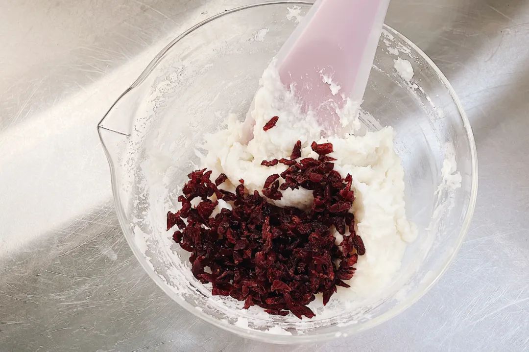 ②蒸山藥的間隙將蔓越莓切成小丁,切碎一些口感更好唷~