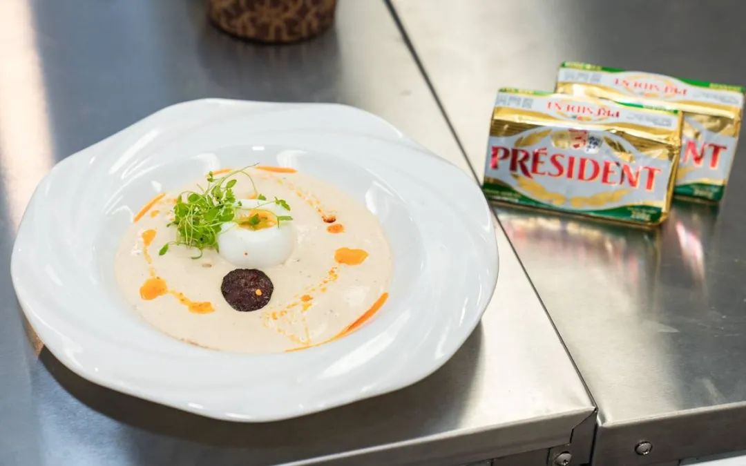 有機(jī)溏心蛋,煙熏四川香腸,洋蔥醬配帕瑪森奶油汁意面醬汁,西餐醬汁,湯底等,在奶油的加持下,加強(qiáng)了奶味柔滑的質(zhì)感,提升了閃亮的色澤。在下午的演示會(huì)上,由Chef Guillaume Comparat為我們親自利用總統(tǒng)烹飪奶油制作了兩道西餐。