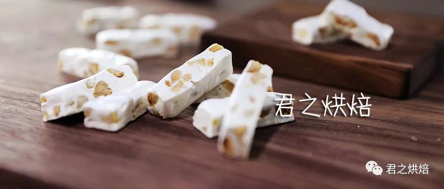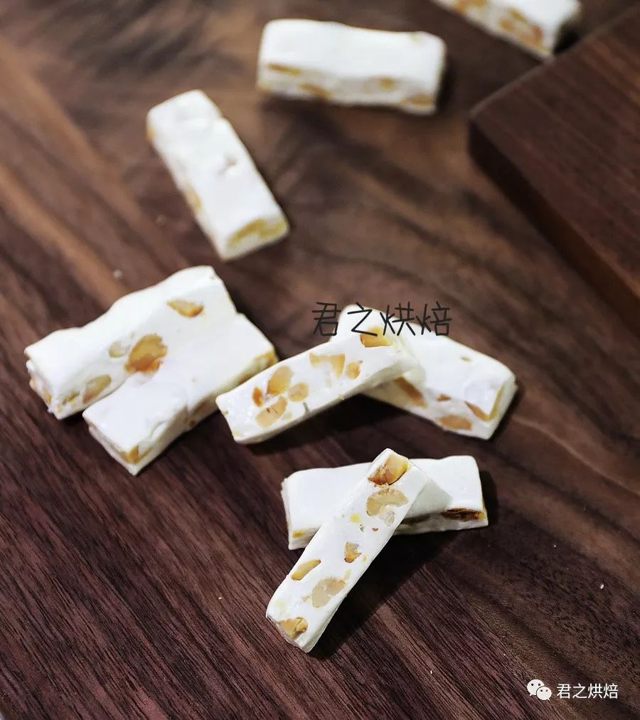 很長很長的Tips:1、牛軋?zhí)且龅煤贸?,必須要具有合適的軟硬度。太硬不僅口感不好,而且容易粘牙。太軟了又會不成型。而牛軋?zhí)堑能浻渤潭?,則和熬糖的溫度直接相關。熬糖的溫度越高,最后得到的牛軋?zhí)蔷蜁接?。冬天制作牛軋?zhí)牵?38℃是一個比較合適的溫度。夏天室溫比較高,為了避免牛軋?zhí)翘洸怀尚?,可以將糖的溫度熬?40℃?!钸@里著重強調,很多同學問為什么自己的牛軋?zhí)亲龀鰜聿怀尚突蛘咛?,都是糖的溫度沒有熬好導致的。一個溫度準確而且讀數(shù)反應迅速的糖漿溫度計非常重要,要知道哪怕只差了幾度,出來的效果也是完全不一樣的,更何況有些溫度計的溫度能差出十幾度。2、這個配方做出的成品牛軋?zhí)菍⒔?斤(連同邊角料算)。如果是家里自己吃,一次做這個量是比較合適的。如果你想一次多做一些,可以將配方分量翻倍。更大的量用廚師機做起來同樣會攪拌得非常得心應手。3、麥芽糖可以不用嗎?麥芽糖可以用蜂蜜代替嗎?——不行。原因我在之前的那篇牛軋?zhí)鞘匙V里已經(jīng)說過了。4、奶粉可以用嬰兒奶粉嗎?最好不要,加入奶粉是為了提香,但嬰兒奶粉缺乏奶香味且偏腥,不是好的選擇。用普通的全脂奶粉即可。5、熬好糖漿以后,之后的動作要盡量迅速。因為糖冷卻以后會變得越來越硬,所以所有的混合攪拌工作都要在糖熱的時候完成(尤其是如果室溫很低的情況下,請盡快)。這也是為什么花生仁需要在加入之前一直保持溫熱。如果涼的花生仁加進去,會導致糖的溫度急劇降低,可能在沒有攪拌均勻之前就變硬了。6、花生仁可以換成扁桃仁,你還可以用核桃仁、黑芝麻、榛子仁等來做不同口味牛軋?zhí)?。熟的堅果就不需要再烤了,但都需要先保持在溫熱再加入糖里?、可以不熬糖嗎?也可以做棉花糖版的牛軋?zhí)枪?,會簡單很多很多。不過,個人覺得熬糖版要好吃很多很多!
