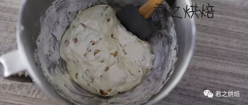 接下來的動作仍然要快。在打蛋盆里加入已經(jīng)提前軟化(或熔化成液態(tài))的黃油,再加入奶粉。廚師機開5檔攪拌一會兒,攪拌到黃油、奶粉跟盆里的糖混合就可以了。