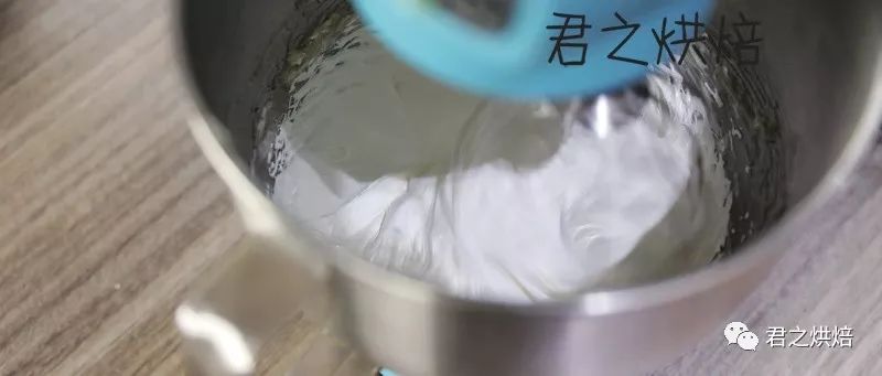 蛋清+15克細砂糖放入君焙廚師機的打蛋盆里,用打蛋籠高速攪打1分半鐘(快速攪拌,最高檔位)。打發(fā)至硬性發(fā)泡狀態(tài)。將蛋清留在打蛋盆里備用。