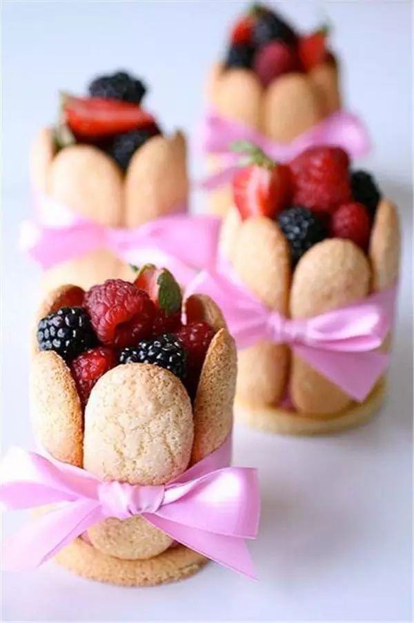 黑莓/樹(shù)莓 慕斯①吉利丁用冷水泡軟,濾掉多余水分,備用②水果泥加糖在平底鍋中小火煮沸,關(guān)火,加入泡好的吉利丁,攪拌至吉利丁完全融化,晾至室溫③淡奶油用電動(dòng)打蛋器打發(fā)至提起有尖角④打發(fā)的淡奶油加入晾至室溫的水果泥混合物,翻拌均勻,裝入裱花袋(黑莓慕斯和樹(shù)莓慕斯做法一樣,分裝兩個(gè)裱花袋)組裝夏洛特①首先你要準(zhǔn)備好手指餅干,正常的手指餅干,以及跟你的慕斯圈相匹配的圓形的手指餅干,就用普通手指餅干的配方(剛剛那個(gè)就行),然后用你的慕斯圈圈個(gè)范圍再擠面糊去烤