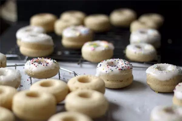 ⑤混合糖粉和熱水,直到糖霜變得順滑,涂抹在甜甜圈上,再撒上彩色糖珠,等糖霜變干