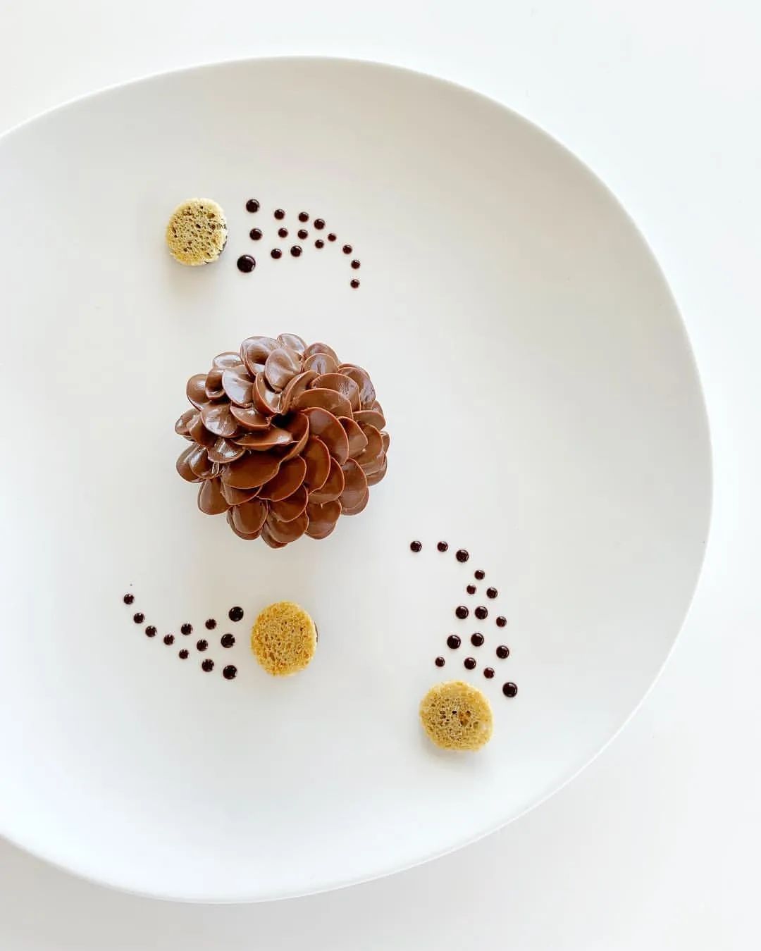 利用盤子本身的設(shè)計(jì),突出甜品主體的美感?;蚴亲粢酝档尼u料裝飾,選擇互補(bǔ)色系形成強(qiáng)烈反差等,勾勒出一幅絕佳的美圖。注意!顏色搭配上不宜選用太過(guò)濃烈的顏色,否則容易喧賓奪主,除非主體甜點(diǎn)本身顏色就很強(qiáng)烈哦~仔細(xì)看看,是不是都沒(méi)用到什么特殊的模具,或是什么高超的技術(shù),僅僅靠著指尖的一抹一涂,完成腦海中的想象畫(huà)面。造型的藝術(shù)劃重點(diǎn)!在給盤式甜點(diǎn)做裝飾時(shí),盡可能選擇足夠大的盤子,一般以白色平底盤為主,可以留出更多發(fā)揮創(chuàng)造的空間,視覺(jué)效果上也會(huì)更好。