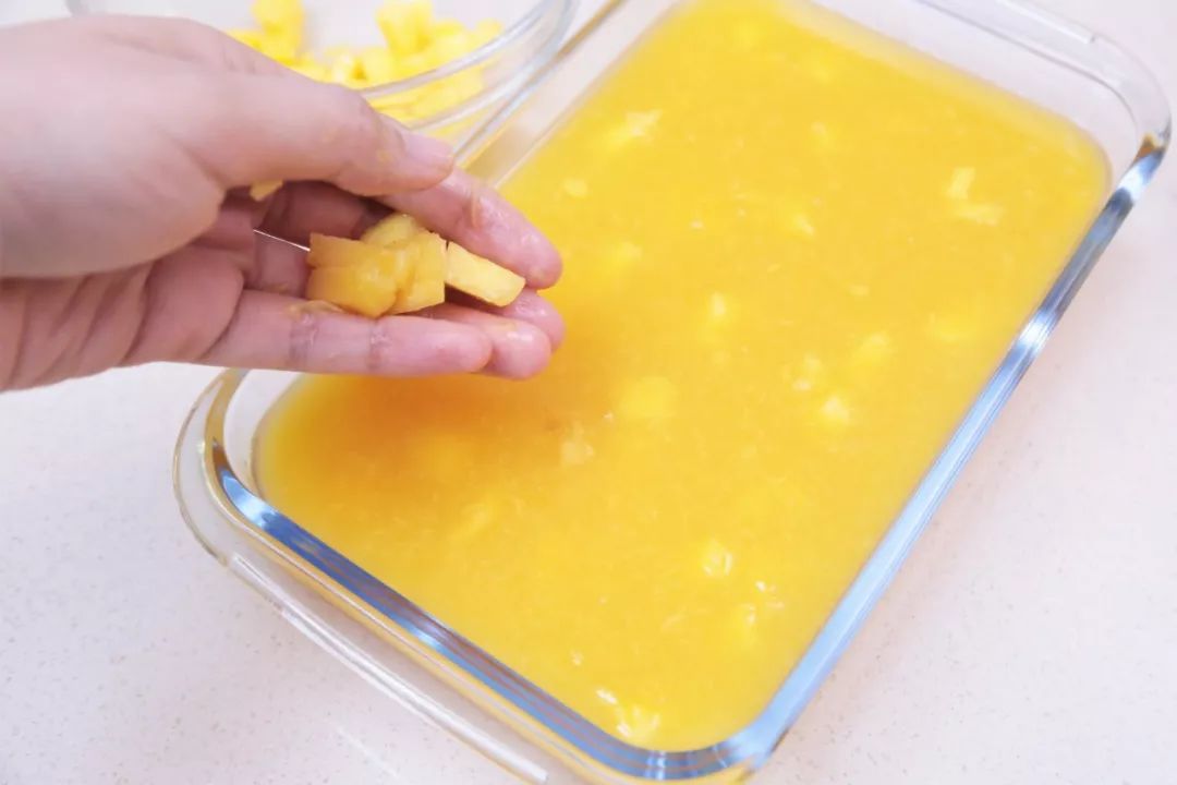 這個(gè)度假風(fēng)甜品造型沒(méi)什么特別的,但是“吃一口就像來(lái)到了芭提雅海灘~”,雖然現(xiàn)在不適合出過(guò)旅游,但是可以在家制作泰國(guó)甜品啊~最近一直高溫不下總是想吃各種清涼的小甜品冰箱里都被我們做的冰棍兒和冰淇淋們?nèi)麧M了但是剩了不少水果和沒(méi)用完的原料立刻陷入思考還能做什么有了!今年很流行芒果色的裙紙哎同色系的甜品應(yīng)該也很受歡迎吧最終就是這款流行色+度假風(fēng)的芒果椰子凍勝出啦~?(^?^*)這款凍一共有兩層上層是濃濃的椰香下層是酸酸甜甜的芒果青檸不要被超過(guò)十行的材料表嚇到了哦做起來(lái)毫不費(fèi)事兒芒果青檸椰漿凍模具:容量約1000ml的深方盤,或其他合適的硅膠模具參考量:約15小塊芒果層:芒果塊 250g橙汁 100g寒天粉10g水 200g細(xì)砂糖 40g青檸檬汁 10g芒果丁 適量椰漿層:寒天粉5g水150g細(xì)砂糖 40g椰漿 150g準(zhǔn)備工作:將芒果去皮切塊,留下部分芒果切丁備用。制作芒果層:①將芒果塊、橙汁一同放入攪拌機(jī)打成果泥,倒入青檸汁攪勻。②將細(xì)砂糖、寒天粉放入水中攪拌,煮至融化。TIP:寒天粉需要在冷水時(shí)加入攪拌,否則容易攪不勻哦。③在瓊脂液中倒入芒果泥攪拌均勻。④將芒果液倒入方盤中,快手撒入芒果丁,冷藏約10分鐘至完全凝固。(芒果丁兒一定要放!成品好看!)制作椰漿層:①將細(xì)砂糖、寒天粉放入水中煮至融化。②倒入椰漿,攪拌均勻。③將椰漿液倒入已經(jīng)凝固的芒果層上,放涼至凝固,切塊食用。保存方法看這里密封冷藏可存放4-5天。——為什么椰漿層這么薄的分割線——因?yàn)樵谒瓦M(jìn)冰箱的千鈞一發(fā)之際手一抖灑了 預(yù)覽時(shí)標(biāo)簽不可點(diǎn)