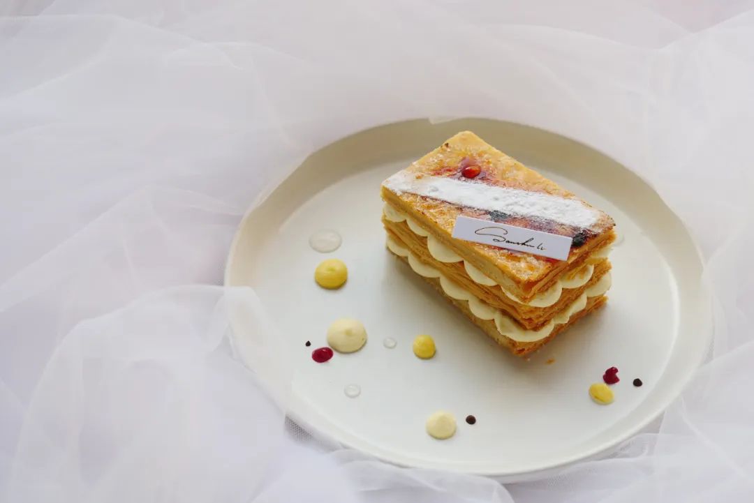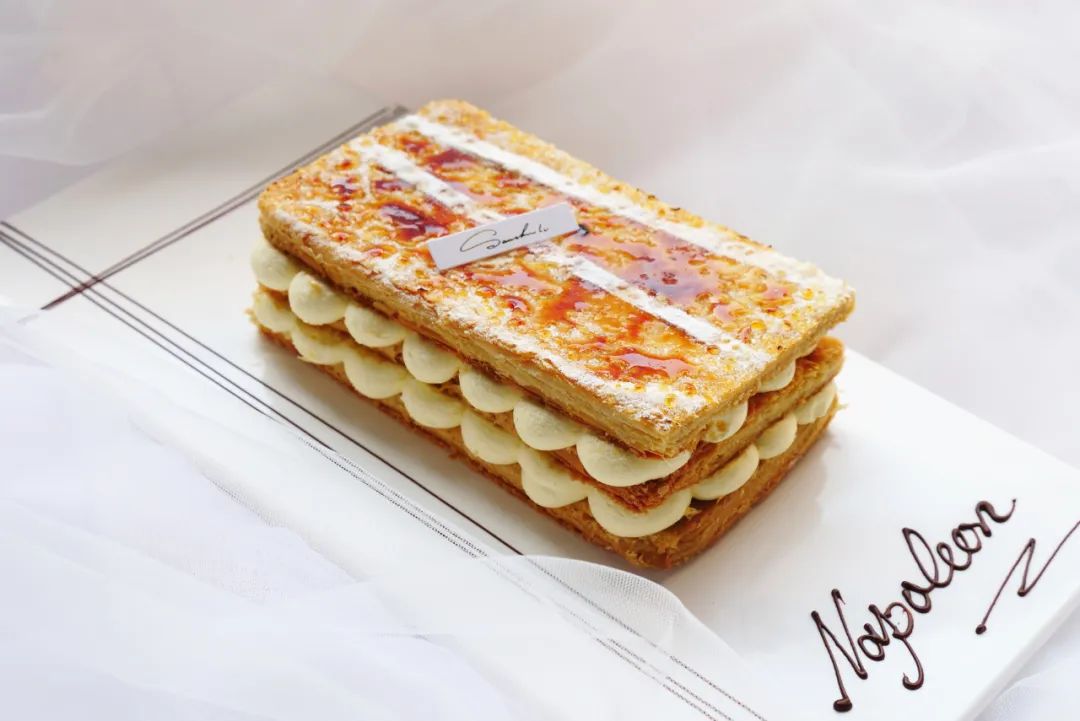 法式杏仁坯搭配咖啡、巧克力,味道濃郁醇香、苦甜適中,濕潤(rùn)的坯體,入口即化的奶油,光亮的淋面,工整的切口,真是太經(jīng)典了~★經(jīng)典千層:拿破侖酥★▽