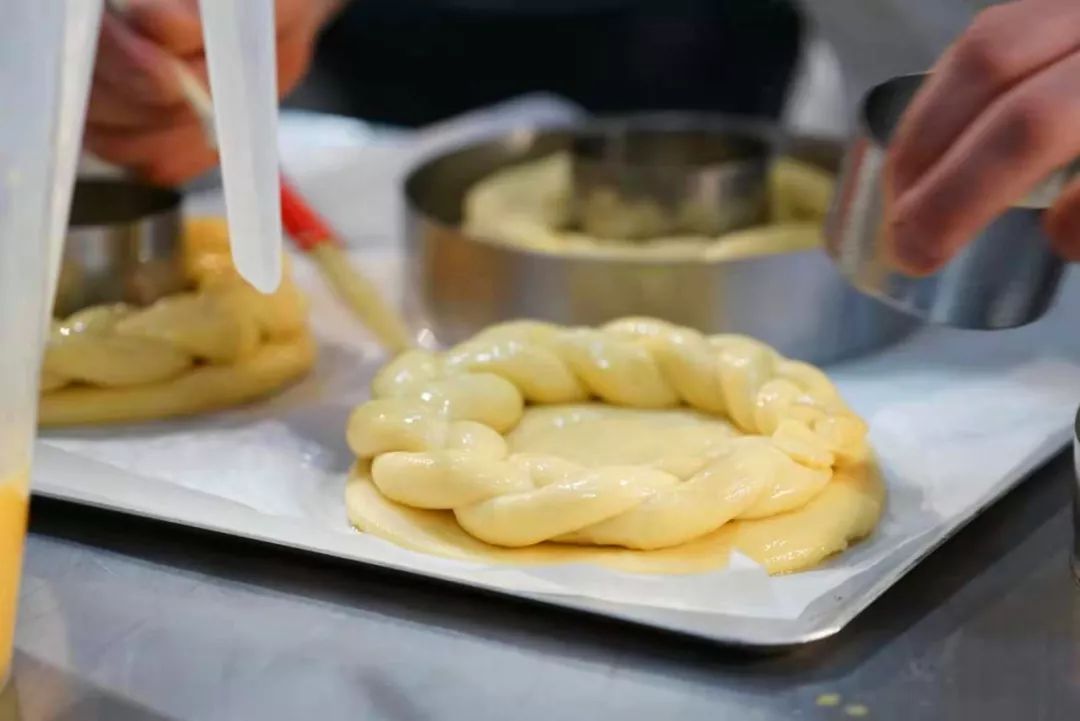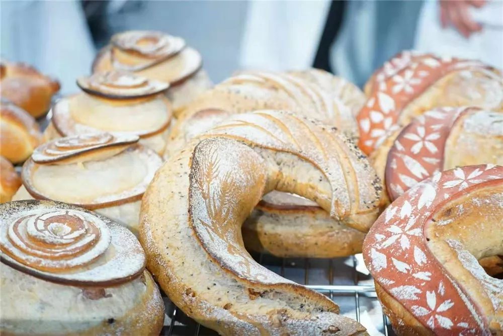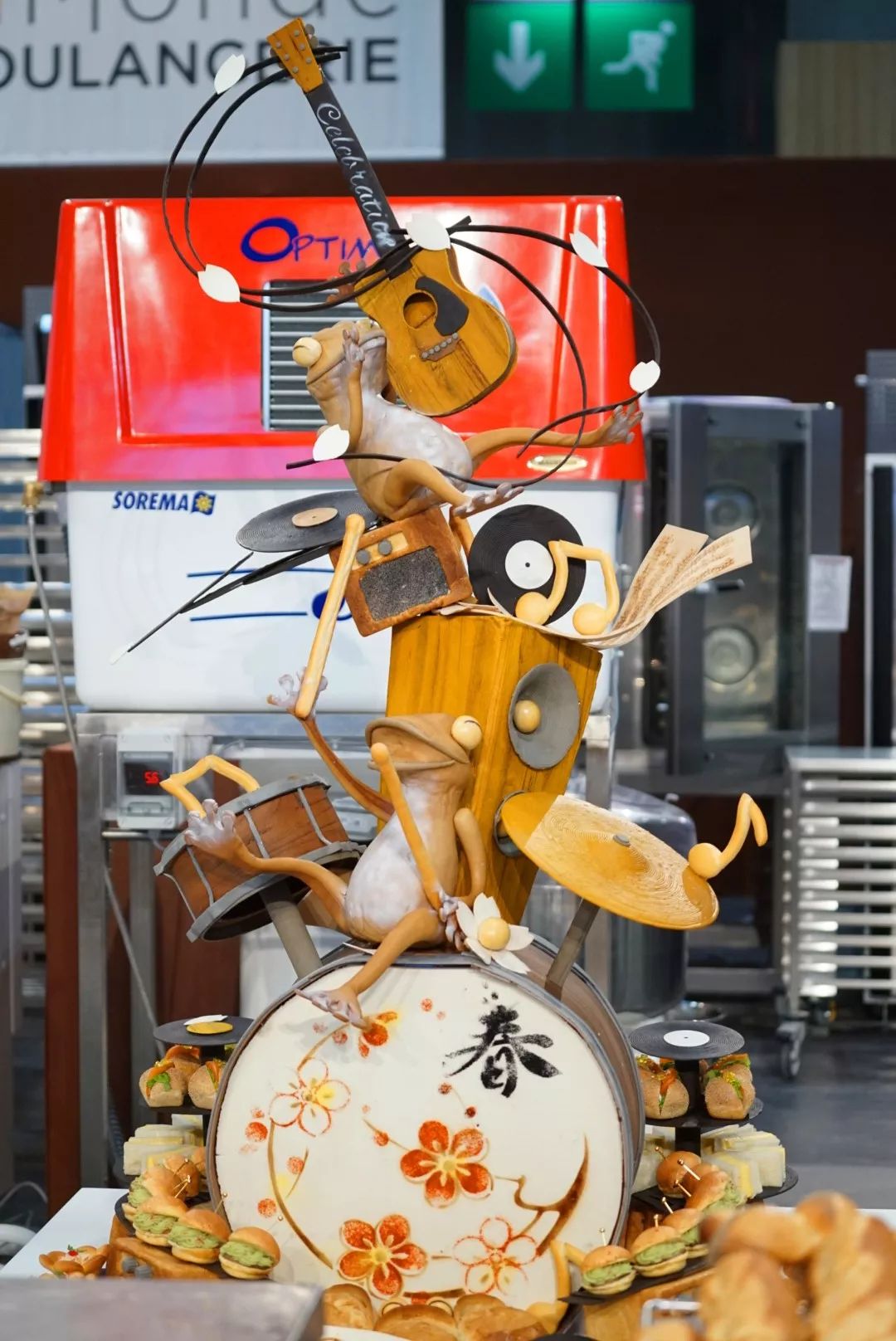 在比賽過去的4個小時中,4支隊伍差不多完成了60%的產(chǎn)品。每支隊伍的桌子上都擺放了水,幫助選手們在比賽過程中補充水分。在藝術面包的創(chuàng)作上,選擇音樂元素的非常多,有五線譜、鼓的元素在其中。荷蘭隊在有條不紊地進行比賽,在桌子上,貼了一張紙,寫的都是比賽的規(guī)劃,可以看出這是一種比賽的方法。藝術面包做的特別逼真,但是荷蘭隊在最后只剩20多分鐘時,藝術面包還有二分之一沒有做好,這對他們來說是個挑戰(zhàn)。韓國隊在做羊角包,沒有用到模板,直接在不銹鋼桌子上進行操作,可以看出每個隊伍選手有自己的方法操作,不拘泥于工具。藝術面包也已經(jīng)做出了一部分。他們做的面包色彩很好,一致性也很好。韓國隊是2016年的冠軍,從今天的比賽來看,韓國隊對比賽的流程、規(guī)則和駕馭能力非常熟練,現(xiàn)場雖然有很多亞洲烘焙人,但從中國走出的還是很少,希望中國的烘焙師也能多出來走走。韓國隊的作品和亞洲賽的作品部分相似,但整體做了改動,作品銜接也做了升級,整體感很好,藝術面包360度都有看點,感覺在做一場“k-pop”的演唱會。日本隊的吐司已經(jīng)烤制出來,很有創(chuàng)意。再用牙簽固定好面包的同時,也在用三角形的模板進行固定,這樣更不容易散開。日本隊的藝術面包也做了升級,細節(jié)處理的很好,在三明治的陳列上也很經(jīng)典,日式的鼓呼應了主題,上面寫著春字,呼應了即將到來的春季。用快樂的打擊樂、青蛙來表達了音樂盛宴。作品有設計感、色彩感、線條感和主題感。日本隊用的發(fā)酵面團的融入度上,主要用于底座,所以評委打分可能會有影響。在面包上,有機營養(yǎng)面包形狀沒有改動,但質感感覺上非常營養(yǎng)。甜面包上一致性、色澤都很好。摩洛哥隊在比賽過去的6個小時中,法棍已經(jīng)烤制出來,面包大部分都在烘烤,丹麥類的已經(jīng)醒發(fā)完成。在現(xiàn)場,還能看到歐洲的烤箱有進爐器,操作起來比較方便。非洲國家的藝術面包比較抽象,跟主流的風格不太一樣。沒太考慮技巧,從底座上看還是比較穩(wěn)的,把國家文化已經(jīng)展示了出來。藝術面團的種類應該不少于5種,藝術面包的形式已經(jīng)更加精細化、線條美的趨勢。更多現(xiàn)場精彩▼