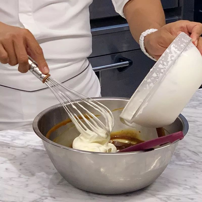 6. 分次拌入晾涼至室溫的焦糖醬中,制成焦糖慕斯