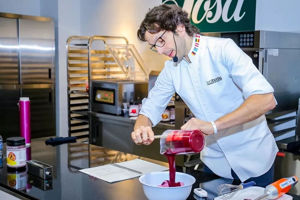 在Jordi看來,“身為甜點(diǎn)師,我們都知道慕斯怎么做,多少度、使用什么樣的操作手法,但實(shí)際上我們并不是真正的懂技術(shù)。”這個(gè)“技術(shù)”不是指操作手法、也不是操作溫度,而是明確的懂得不同的技巧、不同成分的原料在每一個(gè)制作過程中的作用。B概念就是這樣一門學(xué)問,它通過研究各種技巧、不同成分原料在甜點(diǎn)制作中起到的作用和各種組合后會(huì)達(dá)到什么效果來制作天然的、健康的甜點(diǎn)。因此,B概念的落地就需要用到技術(shù)性含量高、品質(zhì)要求也很嚴(yán)格的原料來實(shí)現(xiàn)。Jordi說,“B概念是一套理論,為了實(shí)現(xiàn)它,我獲得了很多支持,比如索薩,在我的B概念推廣中發(fā)揮著很重要的作用,帶給我很多高品質(zhì)的技術(shù)產(chǎn)品。”我參加過他的一次分享會(huì),聽他舉例說明B概念的實(shí)際應(yīng)用:“如果我不喜歡奶油的味道,但是想要保持一樣的質(zhì)地口感,就可以用索薩純天然的食材來操作實(shí)現(xiàn)我的想法?!?img src="http://www.puruisaisi.cn/file/upload/202212/22/122540671.jpeg" data-type="jpeg" data-ratio="0.666" data-w="1000" />索薩Sosa,1967年建立于西班牙,是世界領(lǐng)先的現(xiàn)代廚房原材料食品制造商。致力于推動(dòng)研發(fā)遵循現(xiàn)代美食四大元素的產(chǎn)品:豐富質(zhì)地,更多口味,少糖,少脂肪。B概念=改變質(zhì)地的技術(shù)現(xiàn)在,Jordi和他的團(tuán)隊(duì)把B概念帶到了世界各地,仍在為推廣這套理論不斷的努力著。有人說,B概念的誕生是一項(xiàng)改變甜點(diǎn)質(zhì)地的顛覆性技術(shù),這并不是夸夸其談的狂妄之詞。Jordi曾以芒果慕斯配方為例,用經(jīng)典配方和B概念開發(fā)配方做了一組很清晰的數(shù)據(jù)對(duì)比,結(jié)果如何一眼明了。假設(shè),食譜中的所有原料構(gòu)成了這個(gè)芒果慕斯配方的100%組成,那么每種原料都能用百分比標(biāo)識(shí)出來。我們來看看經(jīng)典配方和B概念配方有何差別吧:芒果慕斯經(jīng)典食譜組成▼