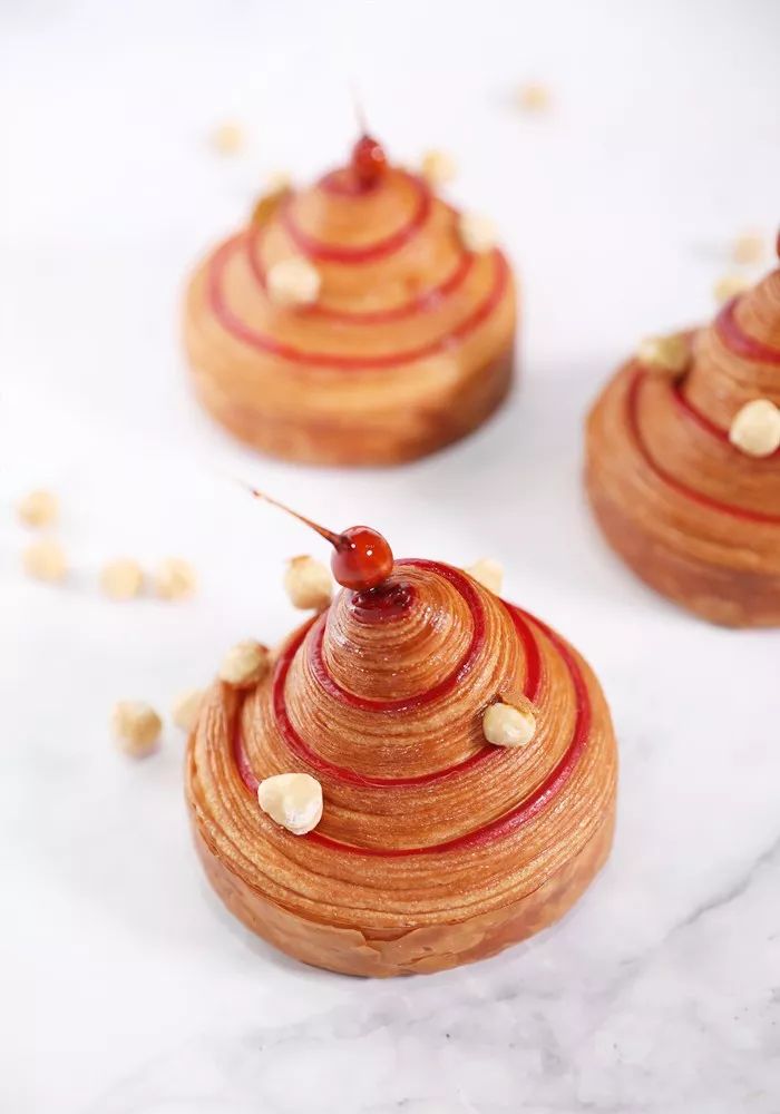 ① 揉面將所有材料放入攪拌機(jī)中,以低速攪拌8分鐘,再以中速攪拌3分鐘,面團(tuán)總重1775g取出255g面團(tuán),在另外的小型攪拌機(jī)里,加入色粉再次攪拌② 分割分割2個(gè)750g原味面團(tuán)和2個(gè)155g著色面團(tuán),滾圓③ 基礎(chǔ)發(fā)酵25℃下發(fā)酵30分鐘,在放入冰箱冷藏30分鐘④ 折疊1次4折,然后1次3折,3折后在表面覆蓋上著色面團(tuán)⑤ 整型將面團(tuán)搟開(kāi)至27cm*50cm尺寸切出3cm*50cm的長(zhǎng)條,并把他們緊緊地卷起成蝸牛狀把它們放入刷過(guò)黃油的直徑10cm*5cm高的圓形模具中⑥ 最終發(fā)酵發(fā)酵箱濕度為90%,29℃發(fā)酵75分鐘⑦ 烘烤以175℃,風(fēng)爐烤17分鐘⑧ 填充餡料出爐時(shí)刷焦糖,從產(chǎn)品底部填入餡料把焦糖榛子、山核桃粘面包上做裝飾即可本配方分享自由同豪國(guó)際和Regal studio主辦的線下演示會(huì),視頻直播回放地址如下:識(shí)別二維碼,免費(fèi)觀看講習(xí)會(huì)回放?- 月度好文 -7w+人烘焙趴快來(lái)啊|2019萬(wàn)圣節(jié)甜點(diǎn)80款剖析:市場(chǎng)流行面包有哪些|萌叔主廚的少女甜點(diǎn)3色軟歐包配方詳解|甜點(diǎn)一定要按配方做?