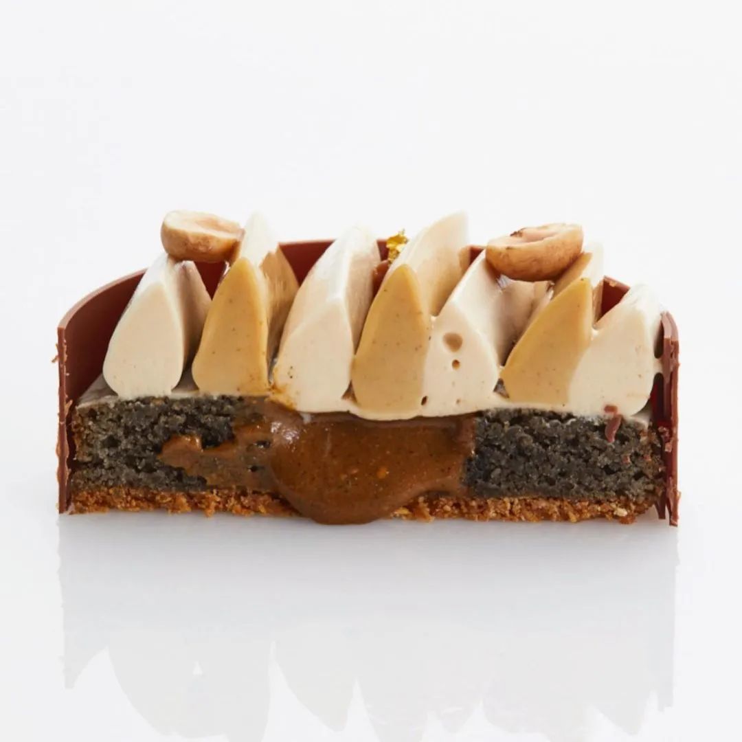 提示:↑點擊上方"世界烘焙配方"快速關注cription-url="https://mmbiz.qpic.cn/mmbiz_jpg/PR7JPt3C5zawKVqAvnVjgkJkKicO3wLSfvxkngAAoDWUqJLBBmuPX3tz9EErvItMfV2IGR6HnCYhZnibRA6KM6Ww/0?wx_fmt.jpeg" data-cropselx1="0" data-cropselx2="578" data-cropsely1="0" data-cropsely2="655" data-ratio="1" data-s="300,640" src="http://www.puruisaisi.cn/file/upload/202212/24/175401921.jpeg" data-type="jpeg" data-w="1080" >chef Eunyoung Yun(下圖)被小編盯上了,今天還是她!就是上邊的這個超人氣“黑芝麻榛子撻”——想品味芝麻、榛子、焦糖以及黃金巧克力甘納許的合體,選它絕對錯不了!3uih?今日配方下載提取碼每天20:30更新,每篇文末左下角“閱讀原文”點擊進入均可下載當日配方、視頻或圖片文件,省去大家自己復制黏貼的麻煩,配方文件無任何水印設置;“提取碼”因近日度娘抽風搞怪,暫不提供無碼下載服務,只能按她的規(guī)矩來,所以下載之前先把這個“提取碼”復制一下~另外,部分地區(qū)可能因為某些不可抗原因導致無法直接點擊閱讀原文,可以在文末的【置頂留言】中找到鏈接和提取碼。黑芝麻榛子撻/黑寡婦BLACK SESAME & HAZELNUT TARTEByEunyoung Yun (GARUHARU)配方量:12個 (直徑7CM)芝麻酥脆餅底【453.6克】 96 克……黃油 96 克……赤砂糖/棕色砂糖0.6 克……鹽119 克……榛子粉 95 克……低筋面粉 47 克……芝麻制作:1、將軟化的黃油、赤砂糖和鹽一起混合攪打。2、加入榛子粉、芝麻和過篩的低筋面粉,攪拌至形成面團。3、搟壓至2毫米厚度,冷凍。4、凍結后,用直徑8厘米的圓形模具切割,直接連同模具一起入烤箱以160℃烘烤約10分鐘。黑芝麻風味榛子奶油餡【500克】132 克……榛子粉103 克……糖粉117 克……全蛋 ? 個……橙皮屑 37 克……黑芝麻醬 19 克……玉米淀粉 22 克……黃油 35 克……蛋白 35 克……細砂糖制作:1、將蛋白在攪拌缸中打發(fā)。2、將砂糖分三至四次加入,打發(fā)至有光澤感的軟尖峰狀態(tài)。3、另一個攪拌缸中,將全蛋、榛子粉、糖粉、橙皮屑和黑芝麻醬混合打發(fā)。4、加入過篩的淀粉拌勻,再將融化至55-60℃的黃油加入拌勻。5、將蛋白霜分兩次加入拌勻。6、裝入裱花袋,在每個“芝麻酥脆餅底”上擠入40克,然后再次入烤箱以160℃烘烤約15分鐘。榛子芝麻帕林內【623克】250 克……榛子 20 克……黑芝麻 20 克……芝麻250 克……細砂糖 58 克……水 25 克……海鹽(蓋朗德)制作:1、將榛子放入烤箱以140℃烘烤約8分鐘。同時將水和細砂糖在厚底平底鍋中加熱至118-121℃。2、當溫度達到118-121℃時,離火,將烤熟的熱的榛子放入糖漿中,攪拌至糖漿翻砂并附著在榛子上。3、繼續(xù)加熱并保持不間斷攪拌,當糖開始焦糖化時,將兩種芝麻加入并繼續(xù)加熱至顏色微微變深。4、倒在硅膠烤墊上并鋪平,靜置至完全冷卻。5、放入破壁機中并放入海鹽,研磨至形成流體糊狀。吉利丁凍【60克】10 克……吉利丁粉(200Bloom)50 克……水制作:1、將比例為1:5的吉利丁粉與冷水混合室溫靜置。2、約20-30分鐘后,會形成果凍狀,將之切割為1-2CM的小丁狀,便于隨時取用。3、冷藏可以儲存14天,冷凍則可以儲存90天。榛子芝麻帕林內奶油【407克】50 克……蛋黃33 克……細砂糖93 克……牛奶93 克……稀奶油82 克……金色巧克力(Dulcey 32%)15 克……可可脂32 克……榛子芝麻帕林內(配方↑) 9 克……吉利丁凍(1:5)制作:1、將蛋黃與一半量的細砂糖(即11.5克)混合攪打至泛白。2、將稀奶油、牛奶和剩余的另一半細砂糖放入厚底平底鍋中加熱至45℃,然后緩慢沖入“步驟1”的蛋黃/細砂糖中拌勻。3、再全部倒回厚底平底鍋中,繼續(xù)加熱并攪拌至形成83-85℃的“英式奶醬”。4、將吉利丁凍加入拌勻,過濾,降溫至45℃。5、將“榛子芝麻帕林內”加入到融化至35℃的金色巧克力和可可脂中拌勻。6、分三至四次拌入到“步驟4”中,用手持均質機充分攪拌乳化。7、冷藏隔夜(12小時)。金色巧克力打發(fā)奶油【411克】 12 克……吉利丁凍(1:5) 84 克……牛奶 96 克……金色巧克力(Dulcey 32%)219 克……稀奶油制作:1、將牛奶加熱至接近沸騰時放入吉利丁凍拌融。2、分次倒在融化至35℃的巧克力中,并用手持均質機充分攪拌乳化至細膩光亮順滑狀態(tài)。3、將加熱至35℃的稀奶油加入,并再次用手持均質機充分攪拌乳。4、冷藏隔夜(12小時),使用時打發(fā)。焦糖醬(裝飾用)【404.4克】 99 克……玉米糖漿 99 克……細砂糖151 克……稀奶油 ? 個……香草莢(剖開刮籽)1.6 克……鹽4.8 克……吉利丁凍(1:5) 49 克……黃油制作:1、將香草莢剖開刮下香草籽,與鹽一起放入稀奶油中加熱至接近沸騰狀態(tài)。2、在另一個厚底平底鍋中,將玉米糖漿和細砂糖加熱至焦糖色。3、然后將“步驟1”的熱奶油緩慢沖入到“步驟2”的焦糖中,攪拌并繼續(xù)加熱至108℃。4、離火降溫至60℃,將吉利丁凍加入拌勻。5、將室溫的黃油加入,用手持均質機充分攪拌乳化。6、常溫靜置12小時后使用。透明果膠噴霧【200克】150 克……鏡面果膠(法芙娜:鉆石淋面) 50 克……水制作:1、將鏡面果膠與水在厚底平底鍋中加熱。2、完全融化混合均勻后,過濾,使用溫度為80℃。牛奶巧克力環(huán)(裝飾配件)【200克】200 克……40%牛奶巧克力(Jivara latte 40%)制作:1、將調溫的牛奶巧克力倒在干凈(無水、無痕)的透明塑料片上,用抹刀薄薄的抹平。2、當巧克力開始凝固結晶時,用切割刀均勻裁切為寬度2.5CM、長度27CM的劃痕。3、然后將之輕