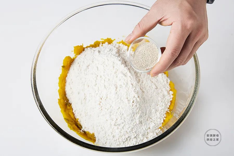②加中筋面粉和酵母,揉成光滑的面團(tuán)。