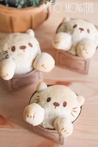 ⑤將8份面團搟成圓形的面片,將炒好放涼的餡料包入面片之中,捏緊收口后放入紙模之中⑥將剩下的一份面團分成16個大面團和16個小面團,作為喵星人的爪子和耳朵,捏在大面團的四角,蓋好保鮮膜,于室溫下發(fā)酵至2倍大小