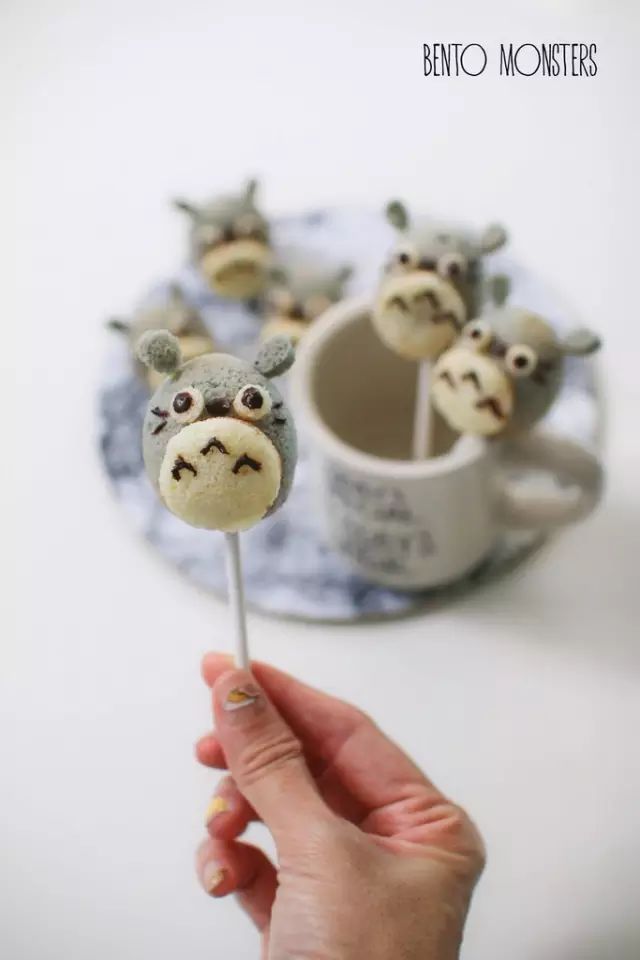 ?從竹炭蛋糕上切出少許不規(guī)整的蛋糕,用切模切出造型,作為龍貓的耳朵,備用?將少許巧克力倒入一個沒有水的干凈容器之中,隔水(微波)將巧克力加熱融化,將兩種蛋糕黏合在一起,做出表情,用棒棒糖棍將蛋糕插起來,即可完成