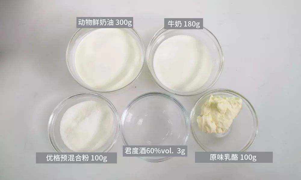 制作TIPS↓> 模具尺寸:半球直徑為3.5cm> 先取1/2芒果果泥加熱是因為果泥加熱很容易導致其氧化變色,預留一半后加入可以保持醬料的色彩更加自然- 優(yōu)格乳酪鮮奶 -▼動物鮮奶油科麥優(yōu)格預混合粉牛奶科麥富特原味乳酪君度酒60%vol.300g100g180g100g3g