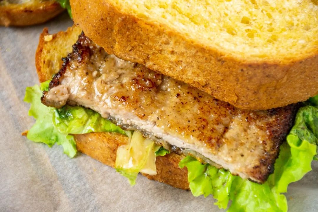 做豬扒包第一步,處理面包,在葡萄牙人們喜歡口感比較硬的面包,通常選用像圓法一類(lèi)的面包,你也可以用一般的全麥面包來(lái)代替。面包片抹上奶油,這樣烤出的面包才能奶香十足、酥脆可口,保證豬扒包完美的口感。第二步,處理豬扒,豬里脊肉經(jīng)過(guò)捶打,纖維被打散,才會(huì)吃起來(lái)鮮嫩。裹上蔬菜汁調(diào)味腌制,再用太白粉鎖住醬汁,然后放進(jìn)鍋中配上奶油煎炸,這樣炸出的豬排口感豐富、咬一口會(huì)爆汁,讓人回味無(wú)窮。