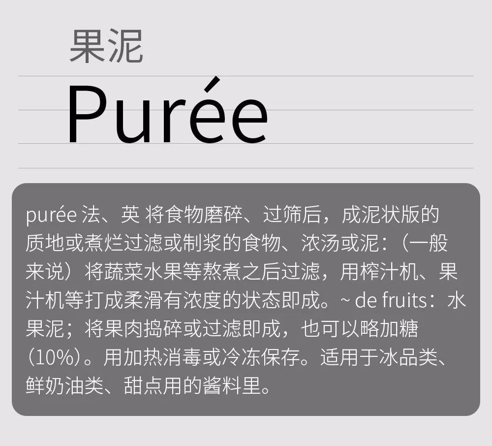 / 文末雙重福利 見者有份 /魔都的天是娃娃的臉說變就變,昨天羽絨服現(xiàn)在就恨不得穿短袖。我有預感夏天說到就要到了(那你還真的是棒棒呢),又是一個擼冰品的好季節(jié)啊。講真,夏天各種應季的果味系列冰品、甜點、飲料之類簡直是掏光錢包的小能手;不管是新鮮水果還是冷凍果泥,在烘焙人眼里幾乎和錢能直接劃等號了。所以,今天我又雙叒叕要化身大家最喜歡的科普小能手啦,科普對象就是它——果泥(purée)。 什么是果泥?▼[注]:釋義參照來源《西點烘焙專業(yè)字典》第2版用通俗易懂的話來解釋的話,什么是果泥應該這樣回答:果泥,為水果的泥狀流體狀態(tài),其主要來源于鮮活果汁的原材料。果泥的制作工序為:在工廠將水果清洗干凈并去皮、去核、去渣,壓榨成泥狀,迅速冷凍;使用時,解凍按需取用即可。更白話一點來說,果泥它就是把新鮮水果壓榨成果泥、經過高溫瞬間滅菌,然后無菌灌裝、冷凍保存的一種常見烘焙原料。因為它的制作過程只是水果形態(tài)的物理變化,不添加任何防腐劑,所以果泥必須-18℃冷凍儲存。/解凍后的果泥狀態(tài)/看完這些,我覺得其實從水果到果泥,只是改變了水果的形態(tài)和保存方式及溫度而已,比如芒果,洗干凈、撕開果皮、用勺子挖出果肉再搗成泥、最大限度保持水果的自然風味,所以很多chef喜歡它也不是沒有道理的,畢竟天然又健康嘛。果泥在烘焙中的應用貌似在常規(guī)認知中,果泥在烘焙中大多都用來調味,比如做夾心、奶油之類,但其實它的應用范疇遠不止于此。不止是烘焙,果泥其實可以被廣泛用在餐飲業(yè)中:制作蛋糕胚、慕斯、夾心、甜品、冰淇淋、布丁、飲品、調酒、果汁及裝飾等…>> 用于制作蛋糕胚 <<>> 用于慕斯、淋面制作 <<>> 用于甜品、冰淇淋、布丁、夾心制作 <<>> 用于飲品、調酒、果汁及裝飾 <<最受歡迎的果泥口味是…既然是用新鮮水果制取而成,那自然而然的,果泥的口味及顏色可供選擇的數量就很多,據說市面上有上百種口味果泥產品。目前在市場上主流的果泥口味主要有以下這些:蔓越莓、藍莓、草莓、芒果、黑加侖、青蘋果、、甜橙、檸檬、水蜜桃、西瓜、哈密瓜、鳳梨、芋香、木瓜葡萄、香蕉、奇異果…但很少有人知道,在這上百種口味果泥中有一個被打上了一個標簽:最受歡迎的果泥口味——芒果。/ 使用芒果果泥制作的甜點 /有產品研發(fā)曾做過研測:在所有品類果泥類產品里,大家對熱帶水果類更加情有獨鐘,而其中最受歡迎的是芒果。芒果果泥為什么最受歡迎?主要可能有以下三點原因:“1、味道:它的香味辨識度很高,更容易被記憶2、營養(yǎng):水果本身的營養(yǎng)價值很高3、顏色:金黃色更容易促使人食欲提升”果泥應用技能tips和很多其他烘焙常見原料一樣,使用果泥制作各種甜點時有很多技術點需要掌握,而并非是解個凍直接用那么簡單。我特地羅列了一些關于果泥應用技能tips,可以說每一條都超級實用哦。▼1、果泥加熱變色怎樣解決、對風味有什么影響?加熱果泥變色是自然現(xiàn)象,風味會更濃一些;防止果泥加熱變色,可以先加熱一部分后再加入另一部分2、果泥解凍再冷凍會不會對風味有影響?果泥解凍再冷凍,1周左右密封好繼續(xù)冷凍沒有什么影響;但時間長了會有影響,水果的風味會流失3、打開包裝未使用完的果泥應該怎樣保存?打開包裝未用完的果泥用保鮮膜包裹一層再加蓋,即可安全冷凍4、果泥應用雷區(qū)有哪些?> 酸性果泥不要直接接觸奶油類,否則會分離> 使用時需調配其他材料一起拌勻比較安全5、果泥口味搭配組合分享?果泥應用搭配技巧:同色系的水果搭配一起會很融合,比如芒果、百香果、菠蘿,又比如草莓、覆盆子、藍莓6、越多口味果泥搭配在一起風味越好嗎?當然不是,果泥口味的搭配并不太適合很多種口味混合在一起,一般情況下它可以和香料混合,芒果和Jelly、樹莓和荔枝或者玫瑰、熱情果和芒果等等,處理好口感平衡即可/ 百香果+芒果 // 草莓+藍莓 /果泥應用范例分享前面有提到果泥的應用范圍很廣,其實在甜點師眼里,即使是同一款單品,也可以用不同口味的果泥創(chuàng)作出整個系列,比如芙蕾杰蛋糕。芙蕾杰(Fraisier)是傳統(tǒng)法式西點里極為經典的一款作品,F(xiàn)raisier直翻譯過來就是“法式草莓夾心海綿蛋糕”的意思。傳統(tǒng)的芙蕾杰是在被分切成數層的法式海綿蛋糕體的各層中夾入含有櫻桃酒的果露、含櫻桃酒的奶油醬以及草莓,表面再涂上粉紅色的奶油醬,并以草莓來做裝飾的甜點。至今芙蕾杰有很多種版本,但是無論怎么變,千層卷的形態(tài)一直都沒變。檸檬鳳梨芙蕾杰▼樹莓芙蕾杰▼芒果百香果芙蕾杰▼