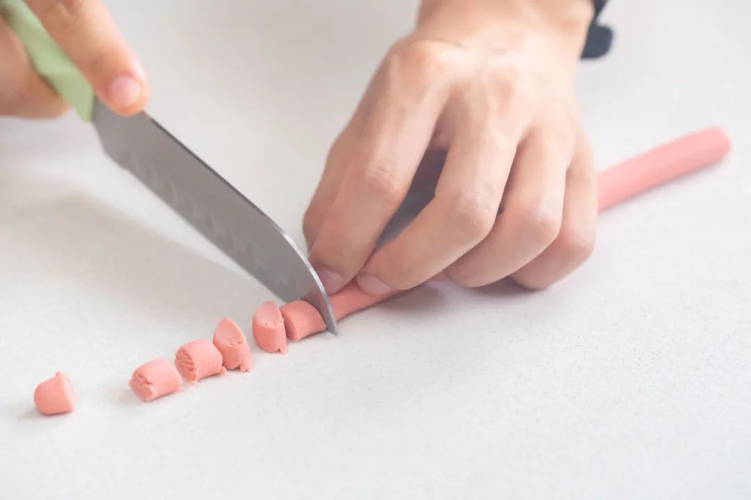 15、用小刀等距切丁。喜歡做阿達(dá)籽的幫友,到這一步就可以把阿達(dá)籽滾上木薯淀粉防粘,然后送入冷凍室長(zhǎng)期保存了,保質(zhì)期約1個(gè)月。