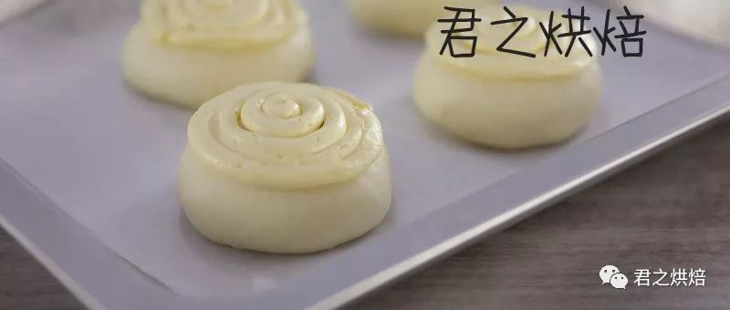 另外4個面團的造型就簡單多了。松弛后的面團再次揉圓,然后稍稍壓扁即可。同樣進行最后發(fā)酵,成為4個圓滾滾的面團。墨西哥面糊(做法見食譜最后)裝入裱花袋。在圓面團頂部擠一圈墨西哥面糊。墨西哥面糊不用覆蓋整個面團,烘烤的時候它自己會化開并覆蓋在整個面團上。另一邊,雙結面團上均勻撒上用朗姆酒泡軟的葡萄干,然后將墨西哥面糊以“S”形擠在表面。