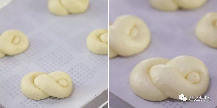 將整形好的面團放在鋪了烤盤紙的烤盤上,進行最后發(fā)酵(理想發(fā)酵溫度35℃,濕度85%)。大約發(fā)酵50分鐘,直到面團變大1倍。注意避免發(fā)酵過度。