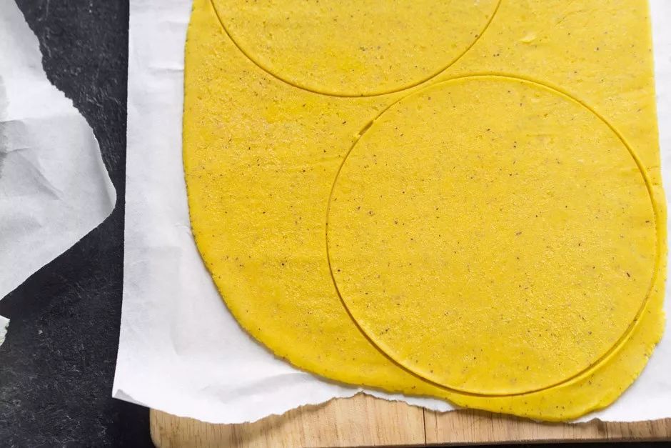 3. 塔底面團搟至2mm厚,用SN3243慕斯圈刻出圓餅,放在兩層鏤空烤墊之間冷凍(上面可以放一小塊邊角用以測試冷凍程度)